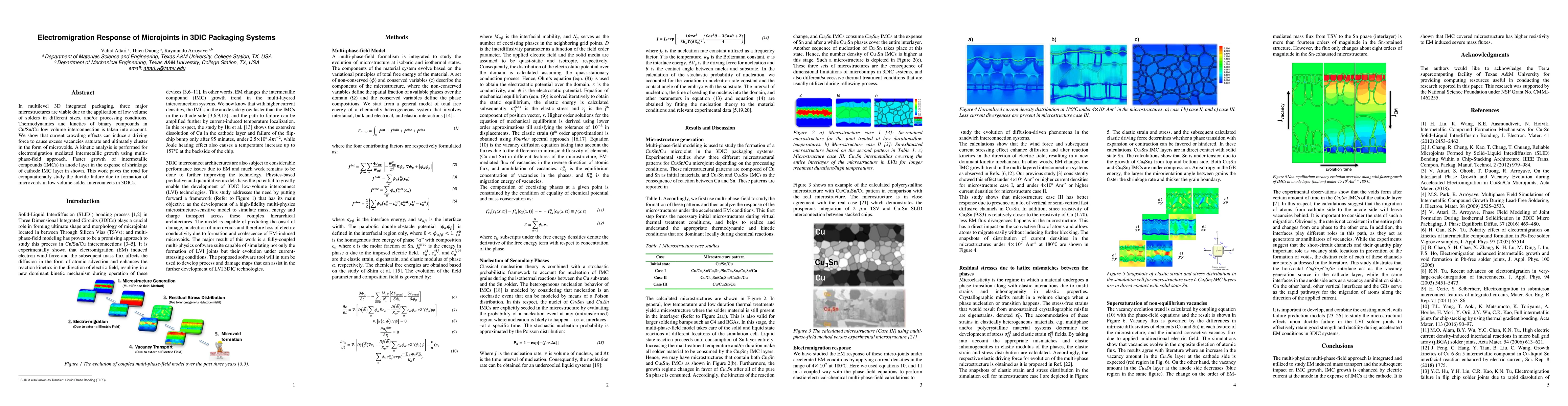 In multilevel 3D integrated packaging, three major microstructures are viable due to the application of low volume of solders in different sizes, and/or processing conditions. Thermodynamics and kinetics of binary compounds in Cu/Sn/Cu low volume interconnection is taken into account. We show that current crowding effects can induce a driving force to cause excess vacancies saturate and ultimately cluster in the form of microvoids. A kinetic analysis is performed for electromigration mediated intermetallic growth using multi-phase-field approach. Faster growth of intermetallic compounds (IMCs) in anode layer in the expense of shrinkage of cathode IMC layer in shown. This work paves the road for computationally study the ductile failure due to formation of microvoids in low volume solder interconnects in 3DICs.