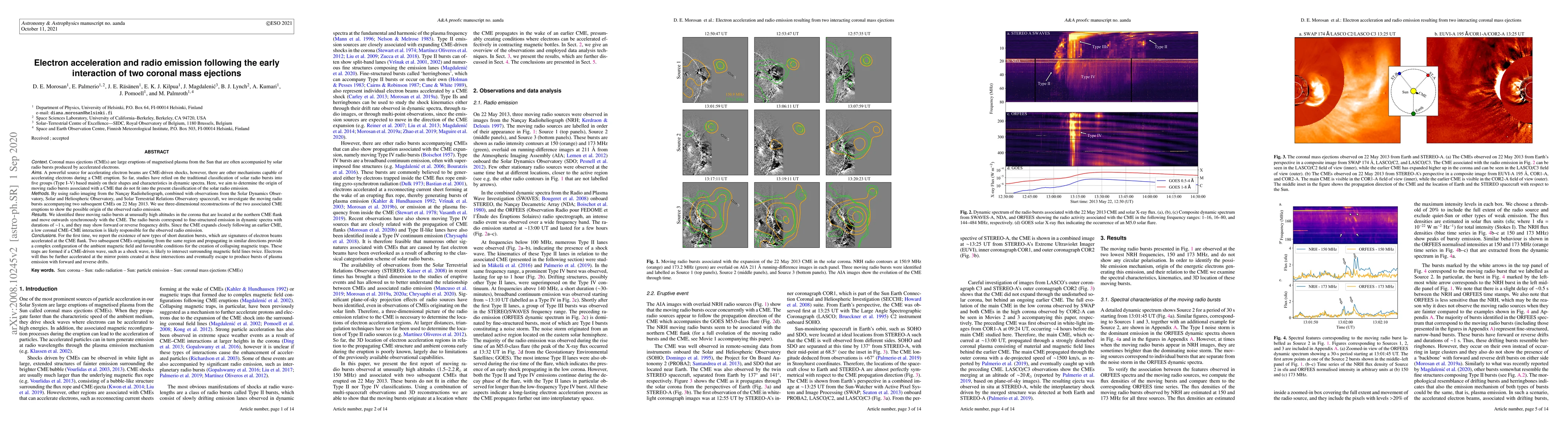 Context. Coronal mass ejections (CMEs) are large eruptions of magnetised plasma from the Sun that are often accompanied by solar radio bursts produced by accelerated electrons. Aims. A powerful source for accelerating electron beams are CME-driven shocks, however, there are other mechanisms capable of accelerating electrons during a CME eruption. So far, studies have relied on the traditional classification of solar radio bursts into five groups (Type I-V) based mainly on their shapes and characteristics in dynamic spectra. Here, we aim to determine the origin of moving radio bursts associated with a CME that do not fit into the present classification of the solar radio emission. Methods. By using radio imaging from the Nan\c{c}ay Radioheliograph, combined with observations from the Solar Dynamics Observatory, Solar and Heliospheric Observatory, and Solar Terrestrial Relations Observatory spacecraft, we investigate the moving radio bursts accompanying two subsequent CMEs on 22 May 2013. We use three-dimensional reconstructions of the two associated CME eruptions to show the possible origin of the observed radio emission. Results. We identified three moving radio bursts at unusually high altitudes in the corona that are located at the northern CME flank and move outwards synchronously with the CME. The radio bursts correspond to fine-structured emission in dynamic spectra with durations of ~1 s, and they may show forward or reverse frequency drifts. Since the CME expands closely following an earlier CME, a low coronal CME-CME interaction is likely responsible for the observed radio emission.