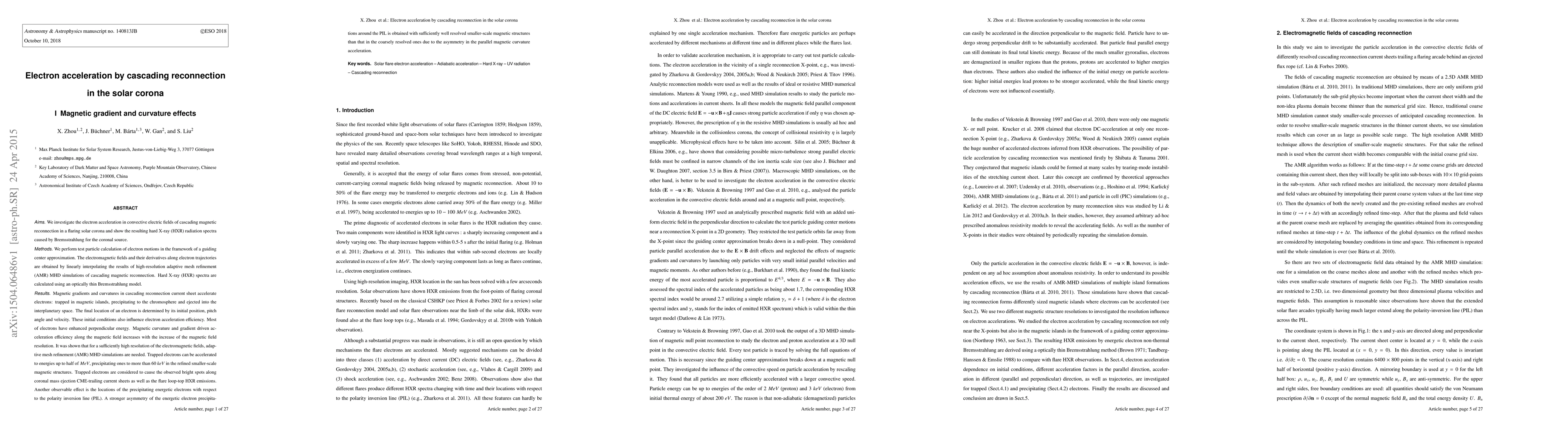 This study investigates electron acceleration in the solar corona during cascading magnetic reconnection, showing that magnetic gradients and curvatures accelerate electrons, leading to hard X-ray emissions via Bremsstrahlung. The results indicate that the initial conditions of electrons significantly influence their final location and acceleration efficiency.
