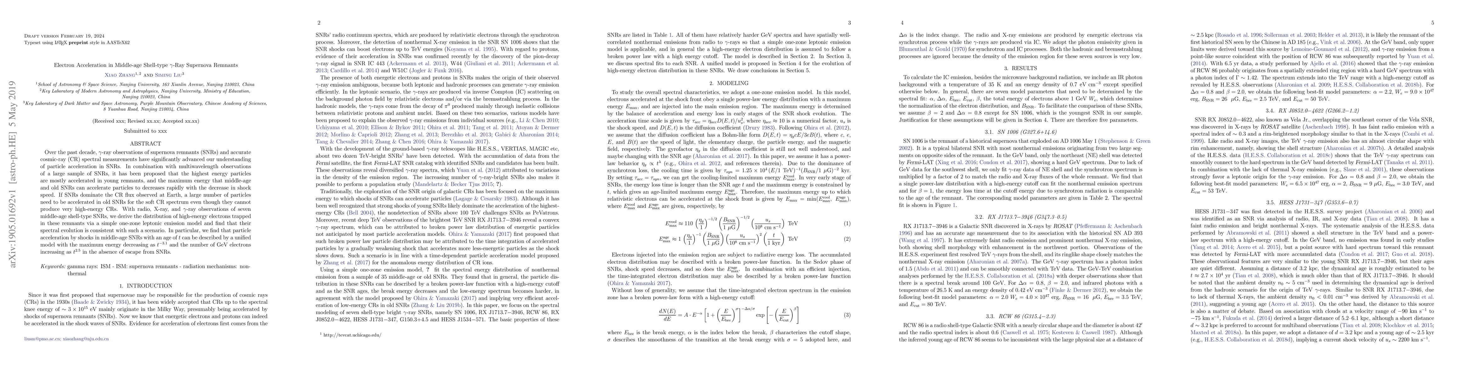Over the past decade, $\gamma$-ray observations of supernova remnants (SNRs) and accurate cosmic-ray (CR) spectral measurements have significantly advanced our understanding of particle acceleration in SNRs. In combination with multiwavelength observations of a large sample of SNRs, it has been proposed that the highest energy particles are mostly accelerated in young remnants, and the maximum energy that middle-age and old SNRs can accelerate particles to decreases rapidly with the decrease in shock speed. If SNRs dominate the CR flux observed at Earth, a large number of particles need to be accelerated in old SNRs for the soft CR spectrum even though they cannot produce very high-energy CRs. With radio, X-ray, and $\gamma$-ray observations of seven middle-age shell-type SNRs, we derive the distribution of high-energy electrons trapped in these remnants via a simple one-zone leptonic emission model and find that their spectral evolution is consistent with such a scenario. In particular, we find that particle acceleration by shocks in middle-age SNRs with an age of $t$ can be described by a unified model with the maximum energy decreasing as $t^{-3.1}$ and the number of GeV electrons increasing as $t^{2.5}$ in the absence of escape from SNRs.