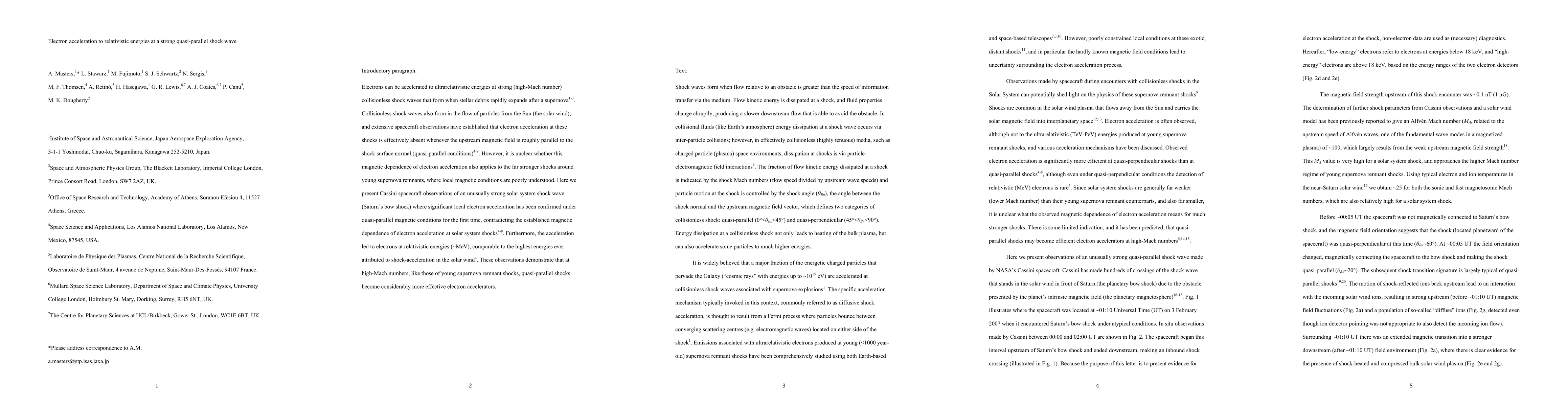 This paper reports Cassini spacecraft observations of electron acceleration to relativistic energies at Saturn's bow shock under quasi-parallel magnetic conditions, challenging the established notion that such conditions inhibit electron acceleration at solar system shocks. This finding suggests that strong shocks, like those of young supernova remnants, can effectively accelerate electrons even when the magnetic field is parallel to the shock surface.