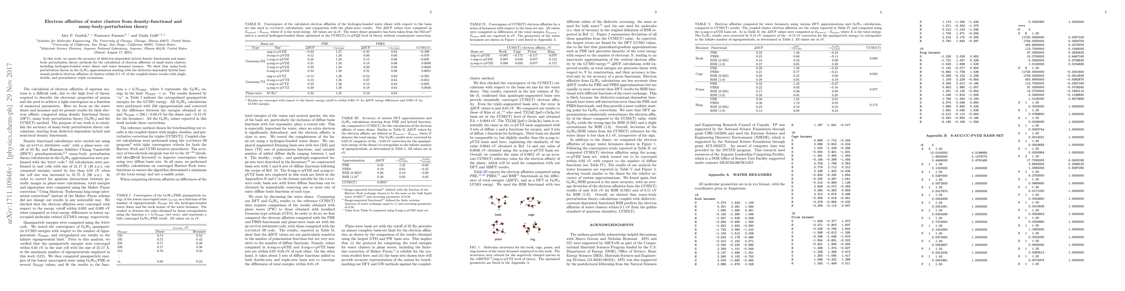 This paper evaluates the accuracy of dielectric-dependent hybrid density functionals and many-body perturbation theory for calculating electron affinities of small water clusters. Many-body perturbation theory in the G$_0$W$_0$ approximation, initiated with hybrid functionals, closely matches coupled-cluster results for water dimers and hexamers.