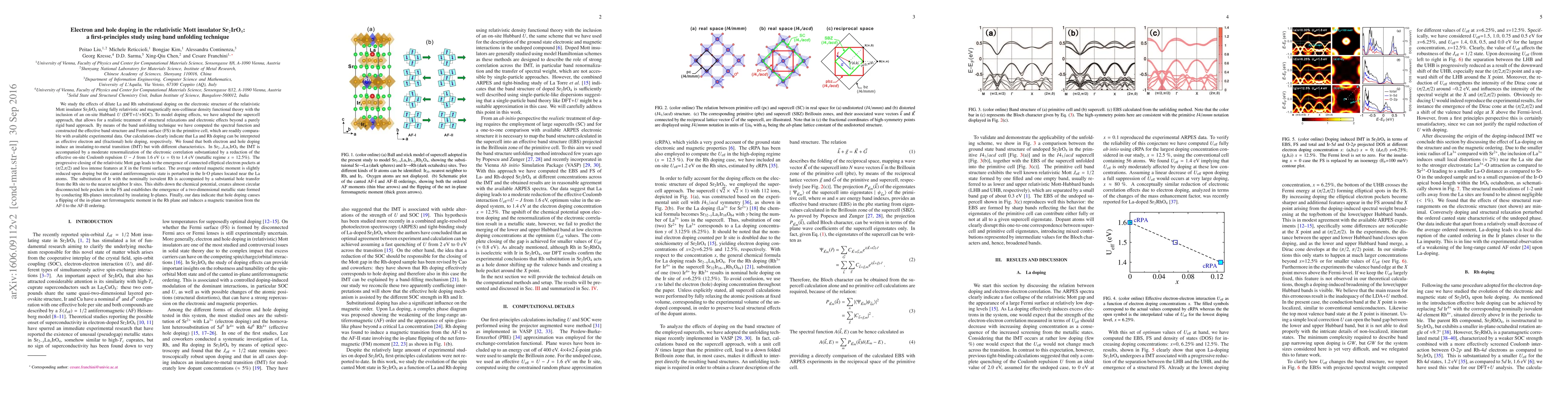 The study uses first-principles calculations and band unfolding to analyze the effects of La and Rh doping in Sr$_2$IrO$_4$. La doping introduces electrons, narrowing the Mott gap and creating electron pockets, while Rh doping, acting as hole doping, shifts the chemical potential, forms hole pockets, and alters magnetic ordering from antiferromagnetic-I to antiferromagnetic-II.