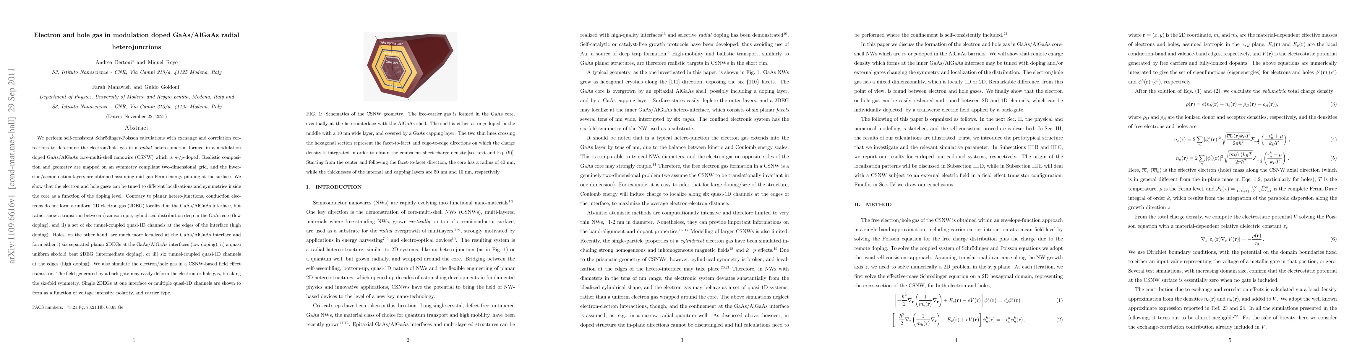This research examines electron and hole gas behavior in modulation doped GaAs/AlGaAs radial heterojunctions using self-consistent calculations, revealing that electron and hole distributions vary with doping level and can transition between different symmetries and localizations. The study also simulates CSNW-based field effect transistors, showing how back-gate fields can alter electron or hole gas configurations.