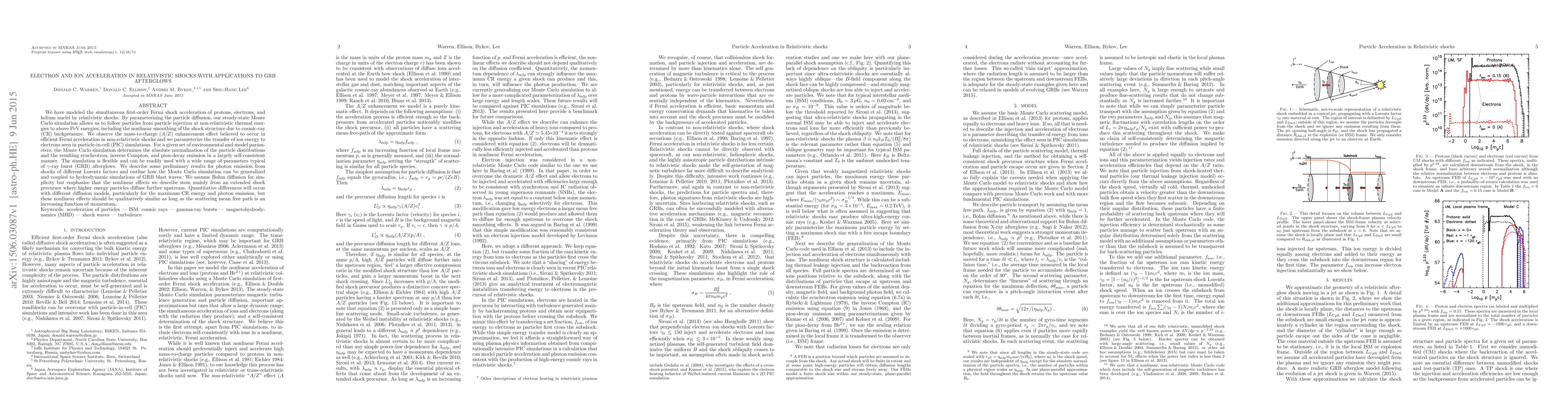 This paper models the Fermi shock acceleration of protons, electrons, and helium nuclei in relativistic shocks, simulating particle energy distribution and emission up to PeV energies. The study uses a Monte Carlo simulation to determine synchrotron, inverse-Compton, and pion-decay emissions, and it outlines its application to gamma-ray burst afterglows.