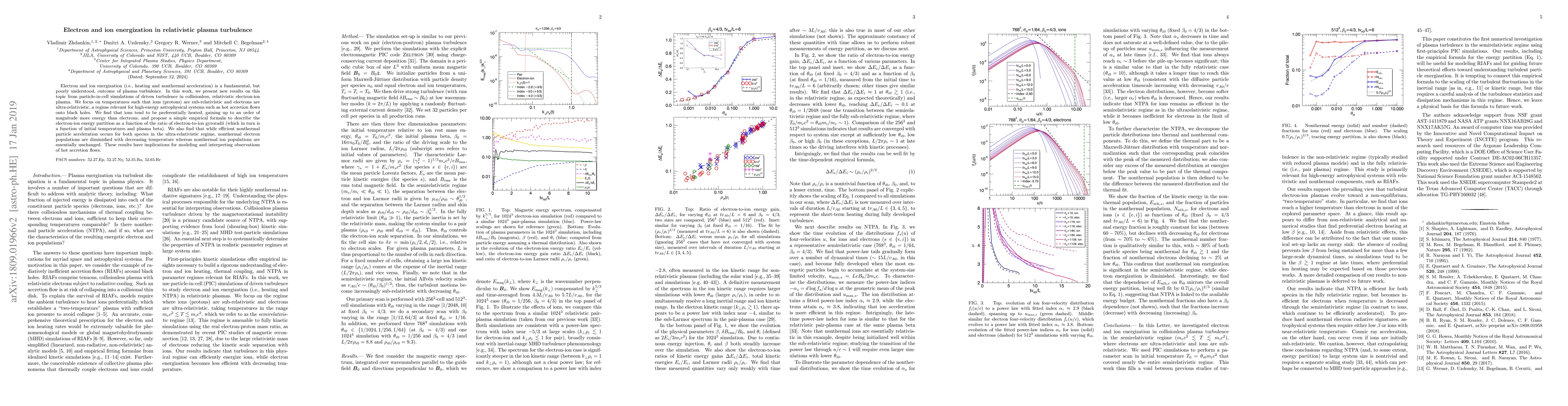 This study uses particle-in-cell simulations to investigate electron and ion energization in relativistic plasma turbulence, finding that ions are preferentially heated more than electrons, and proposes an empirical formula for energy partitioning based on gyroradii ratios. Nonthermal acceleration is efficient for both species in ultra-relativistic regimes, but electron populations diminish with lower temperatures.
