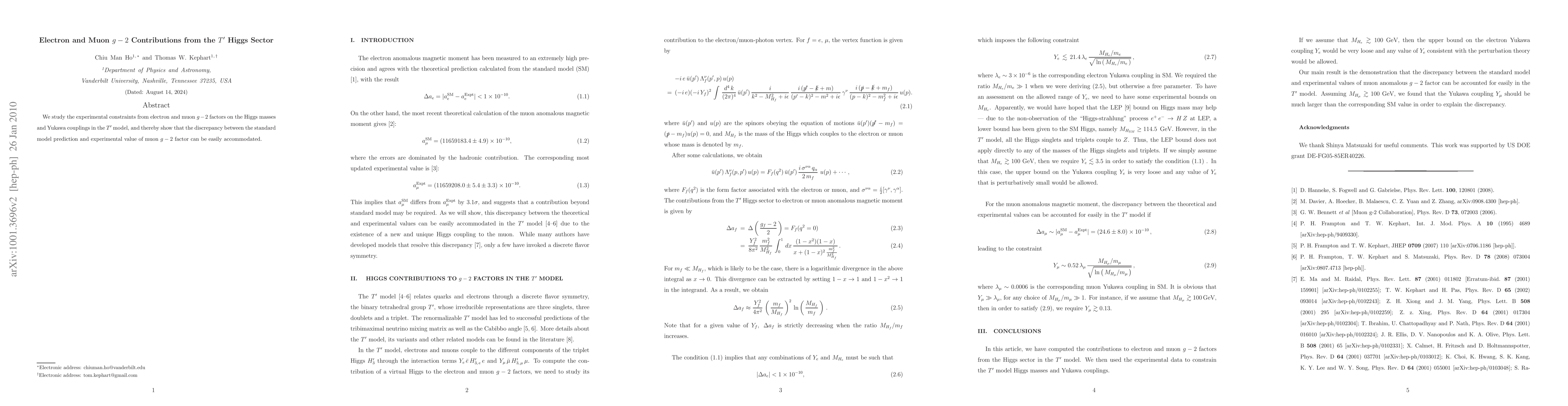We study the experimental constraints from electron and muon $g-2$ factors on the Higgs masses and Yukawa couplings in the $T'$ model, and thereby show that the discrepancy between the standard model prediction and experimental value of muon anomalous $g-2$ factor can be easily accommodated.