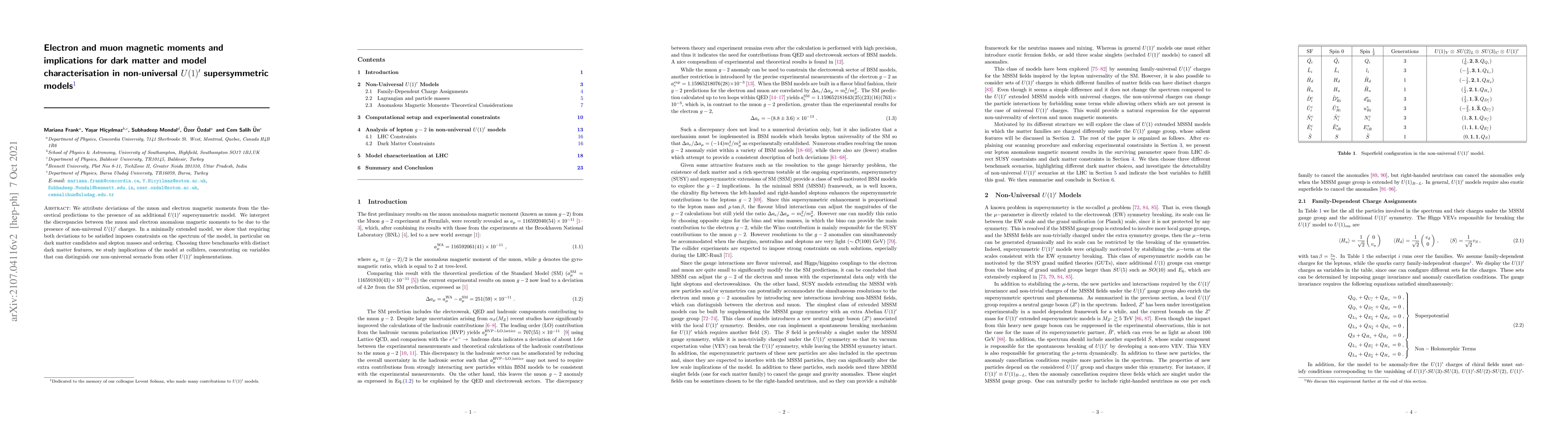 This paper explores how deviations in the magnetic moments of electrons and muons suggest the presence of a non-universal $U(1)^\prime$ supersymmetric model, with implications for dark matter and slepton characteristics. It identifies specific model benchmarks and examines collider signatures that differentiate this scenario from other $U(1)^\prime$ implementations.
