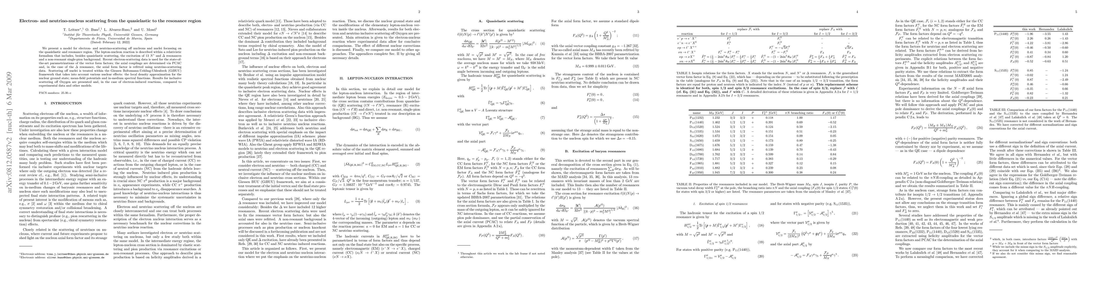 We present a model for electron- and neutrino-scattering off nucleons and nuclei focussing on the quasielastic and resonance region. The lepton-nucleon reaction is described within a relativistic formalism that includes, besides quasielastic scattering, the excitation of 13 N* and Delta resonances and a non-resonant single-pion background. Recent electron-scattering data is used for the state-of-the-art parametrizations of the vector form factors; the axial couplings are determined via PCAC and, in the case of the Delta resonance, the axial form factor is refitted using neutrino-scattering data. Scattering off nuclei is treated within the GiBUU framework that takes into account various nuclear effects: the local density approximation for the nuclear ground state, mean-field potentials and in-medium spectral functions. Results for inclusive scattering off Oxygen are presented and, in the case of electron-induced reactions, compared to experimental data and other models.