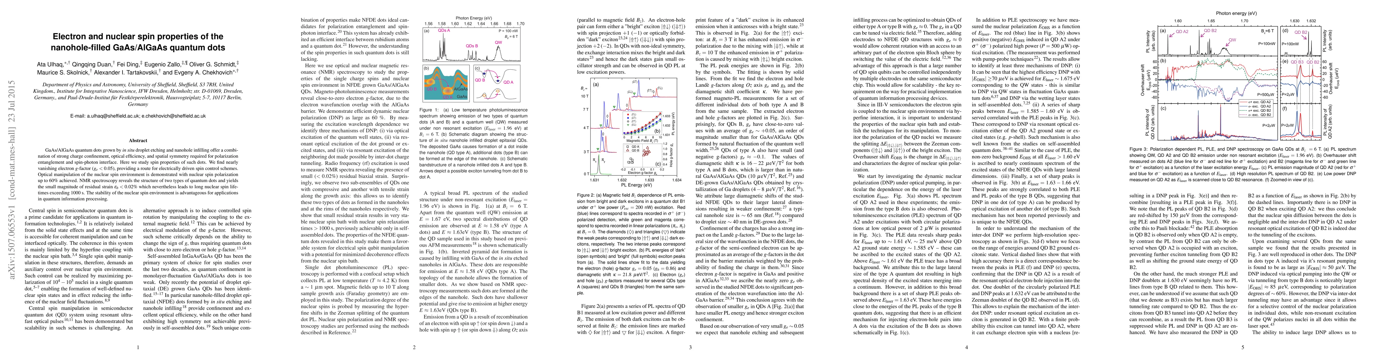 This paper investigates the electron and nuclear spin properties of nanohole-filled GaAs/AlGaAs quantum dots, finding a nearly vanishing electron $g$-factor, which supports electrically driven spin control. It also demonstrates optical manipulation of nuclear spins up to $60\%$ polarization, with residual strain causing long nuclear spin lifetimes beneficial for quantum information processing.