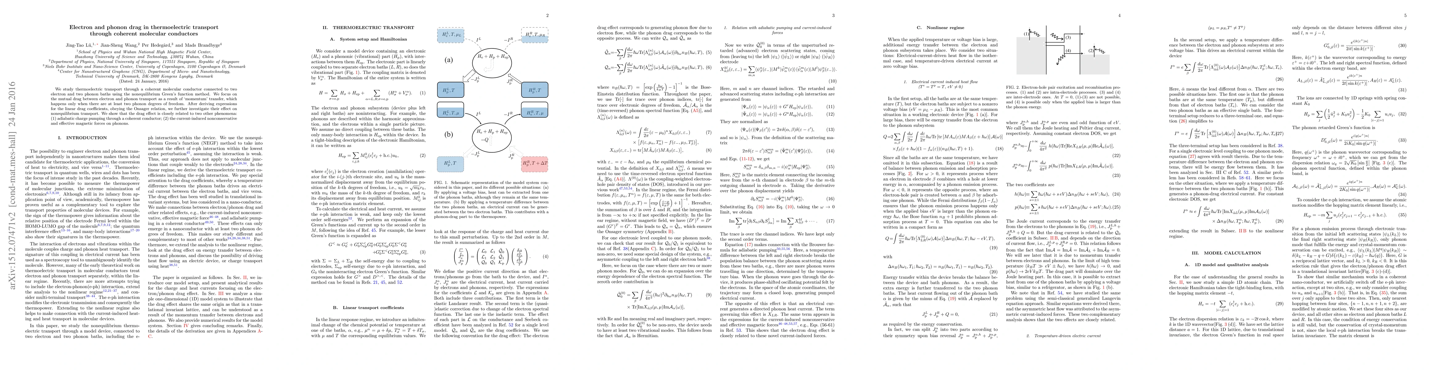 The research investigates thermoelectric transport in a molecular conductor connected to electron and phonon baths, focusing on electron-phonon drag effects due to momentum transfer. It derives linear drag coefficients and explores their impact on nonequilibrium transport, linking these effects to adiabatic charge pumping and current-induced forces on phonons.