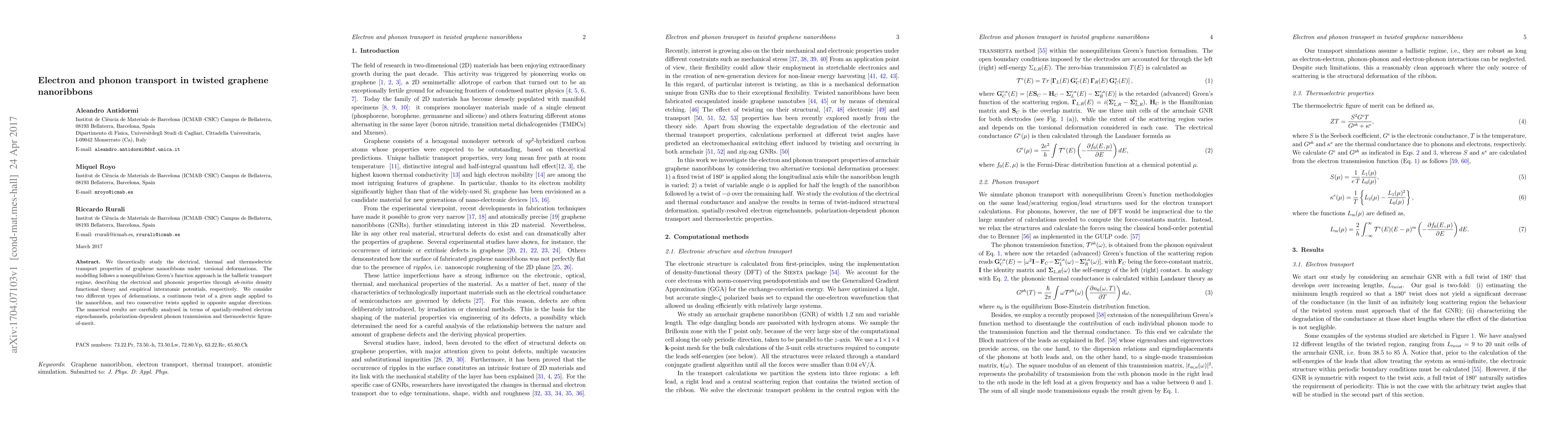 This paper theoretically investigates the electrical, thermal, and thermoelectric transport in twisted graphene nanoribbons using nonequilibrium Green's function and \textit{ab-initio} methods. It analyzes the effects of torsional deformations on electron eigenchannels, phonon transmission, and the thermoelectric figure-of-merit.
