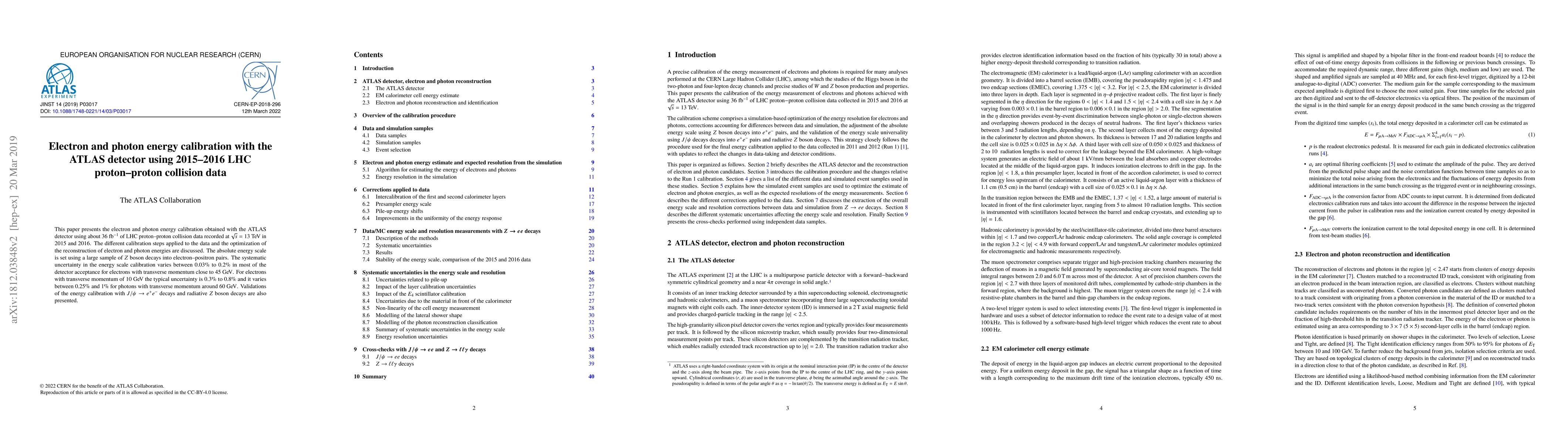 This paper details the calibration of electron and photon energies in the ATLAS detector using 36 fb$^{-1}$ of LHC proton-proton collision data at $\sqrt{s}=13$ TeV. The calibration optimizes reconstruction and sets the absolute energy scale using $Z$ boson decays, achieving systematic uncertainties between 0.03% to 1% depending on particle type and momentum.