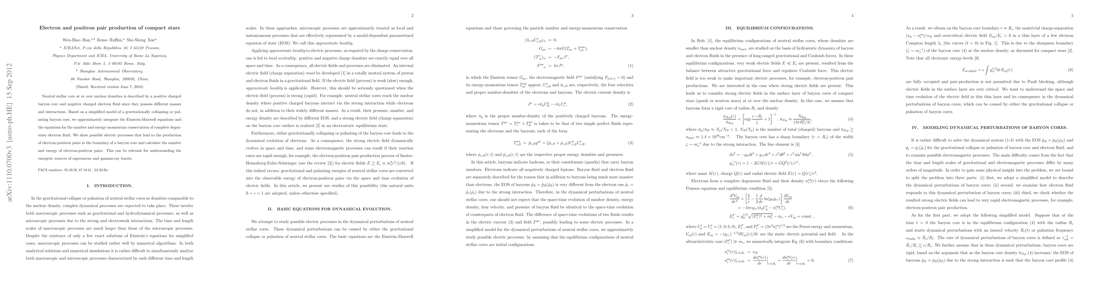 Neutral stellar core at or over nuclear densities is described by a positive charged baryon core and negative charged electron fluid since they possess different masses and interactions. Based on a simplified model of a gravitationally collapsing or pulsating baryon core, we approximately integrate the Einstein-Maxwell equations and the equations for the number and energy-momentum conservation of complete degenerate electron fluid. We show possible electric processes that lead to the production of electron-positron pairs in the boundary of a baryon core and calculate the number and energy of electron-positron pairs. This can be relevant for understanding the energetic sources of supernovae and gamma-ray bursts.