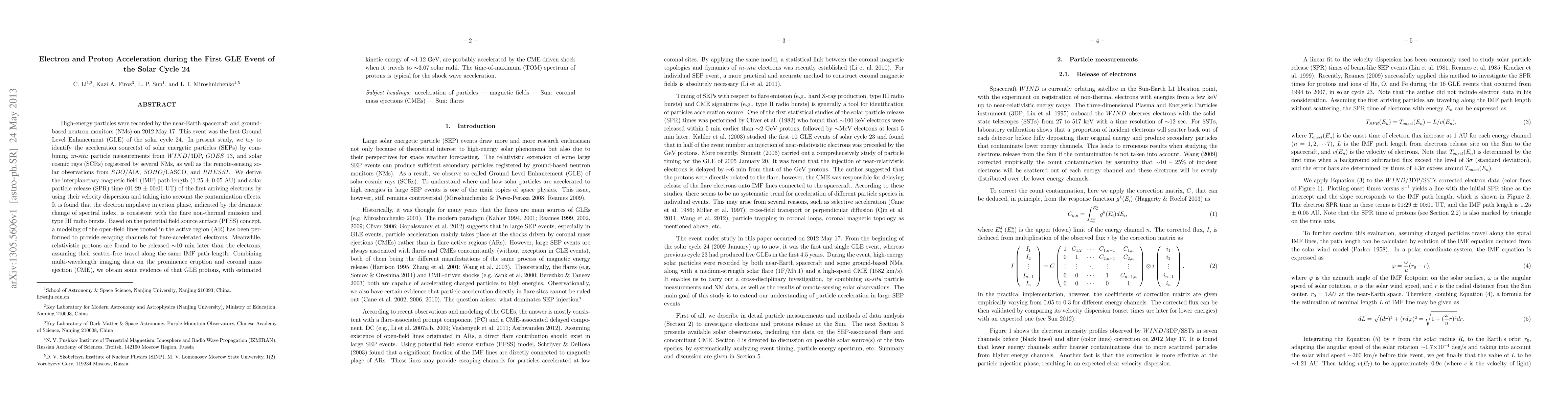 This study investigates the acceleration mechanisms of electrons and protons during the first ground level enhancement (GLE) of solar cycle 24 on May 17, 2012. Electrons show impulsive injection consistent with flare activity, while protons are likely accelerated by a CME-driven shock at 3.07 solar radii.