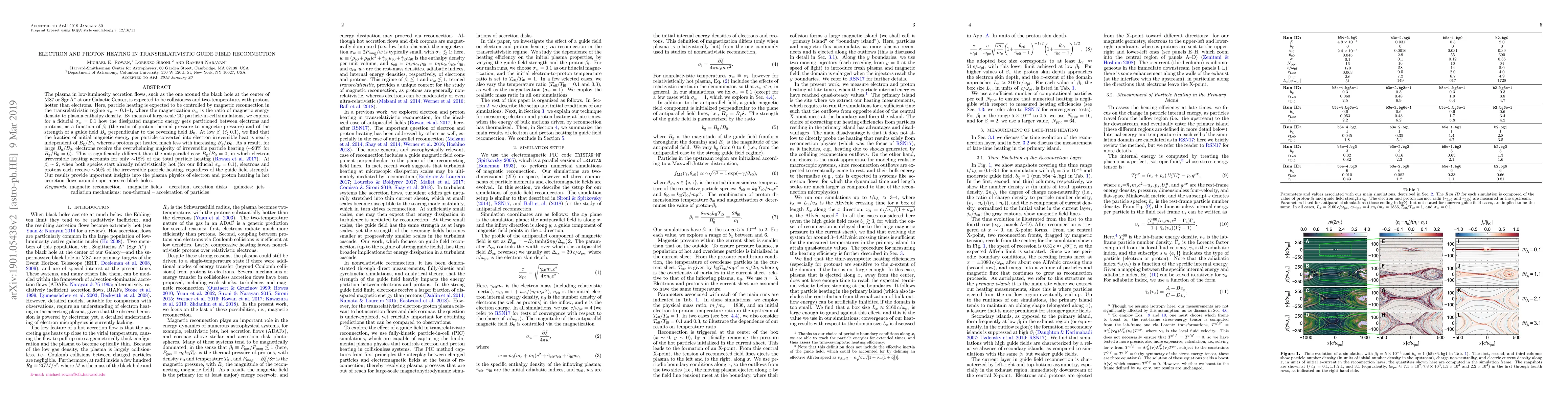 The plasma in low-luminosity accretion flows, such as the one around the black hole at the center of M87 or Sgr A* at our Galactic Center, is expected to be collisioness and two-temperature, with protons hotter than electrons. Here, particle heating is expected to be controlled by magnetic reconnection in the transrelativistic regime $\sigma_{w}\sim 0.1$-$1$, where the magnetization $\sigma_{w}$ is the ratio of magnetic energy density to plasma enthalpy density. By means of large-scale 2D particle-in-cell simulations, we explore for a fiducial $\sigma_w=0.1$ how the dissipated magnetic energy gets partitioned between electrons and protons, as a function of $\beta_{\rm i}$ (the ratio of proton thermal pressure to magnetic pressure) and of the strength of a guide field $B_{\rm g}$ perpendicular to the reversing field $B_0$. At low $\beta_{\rm i}\;(\lesssim 0.1)$, we find that the fraction of initial magnetic energy per particle converted into electron irreversible heat is nearly independent of $B_{\rm g}/B_0$, whereas protons get heated much less with increasing $B_{\rm g}/B_0$. As a result, for large $B_{\rm g} /B_{0}$, electrons receive the overwhelming majority of irreversible particle heating (${\sim}93\%$ for $B_{\rm g} /B_{0}=6$). This is significantly different than the antiparallel case $B_{\rm g}/B_0=0$, in which electron irreversible heating accounts for only ${\sim}18\%$ of the total particle heating. At $\beta_{\rm i} \sim 2$, when both species start already relativistically hot (for our fiducial $\sigma_w=0.1$), electrons and protons each receive ${\sim}50\%$ of the irreversible particle heating, regardless of the guide field strength. Our results provide important insights into the plasma physics of electron and proton heating in hot accretion flows around supermassive black holes.