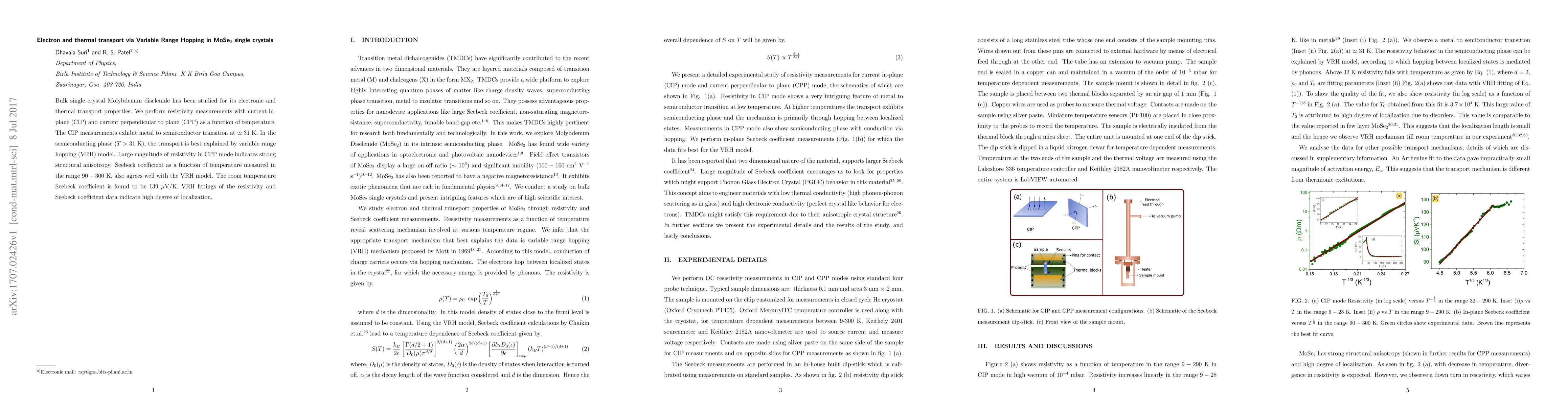 Bulk single crystal Molybdenum diselenide has been studied for its electronic and thermal transport properties. We perform resistivity measurements with current in-plane (CIP) and current perpendicular to plane (CPP) as a function of temperature. The CIP measurements exhibit metal to semiconductor transition at $\simeq 31$ K. In the semiconducting phase ($T > 31$ K), the transport is best explained by variable range hopping (VRH) model. Large magnitude of resistivity in CPP mode indicates strong structural anisotropy. Seebeck coefficient as a function of temperature measured in the range $90 - 300$ K, also agrees well with the VRH model. The room temperature Seebeck coefficient is found to be $139$ $\mu$V/K. VRH fittings of the resistivity and Seebeck coefficient data indicate high degree of localization.
