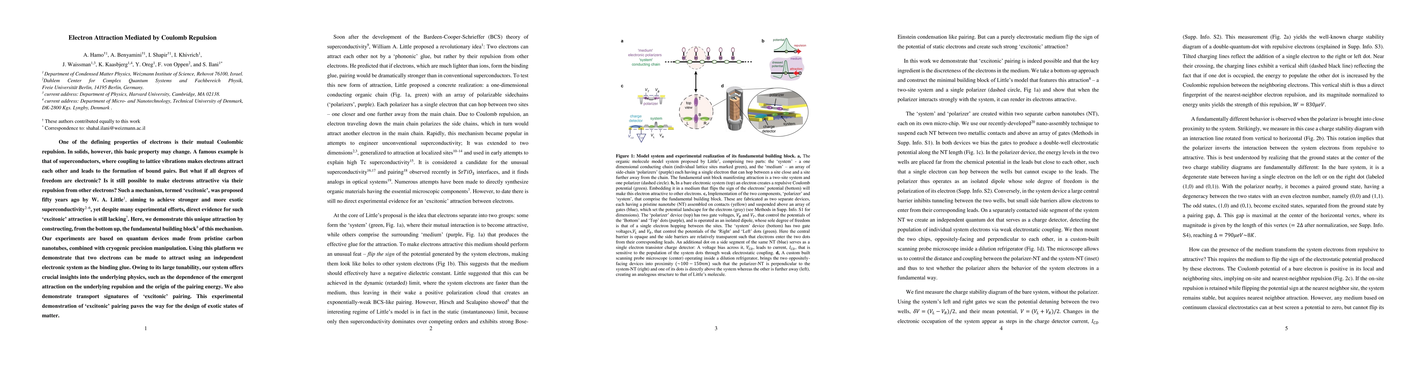 This paper demonstrates the "excitonic" attraction between electrons mediated by their mutual Coulomb repulsion, achieved through precise manipulation in quantum devices made from carbon nanotubes. This finding provides insights into the underlying physics and transport signatures, potentially leading to the development of novel states of matter.
