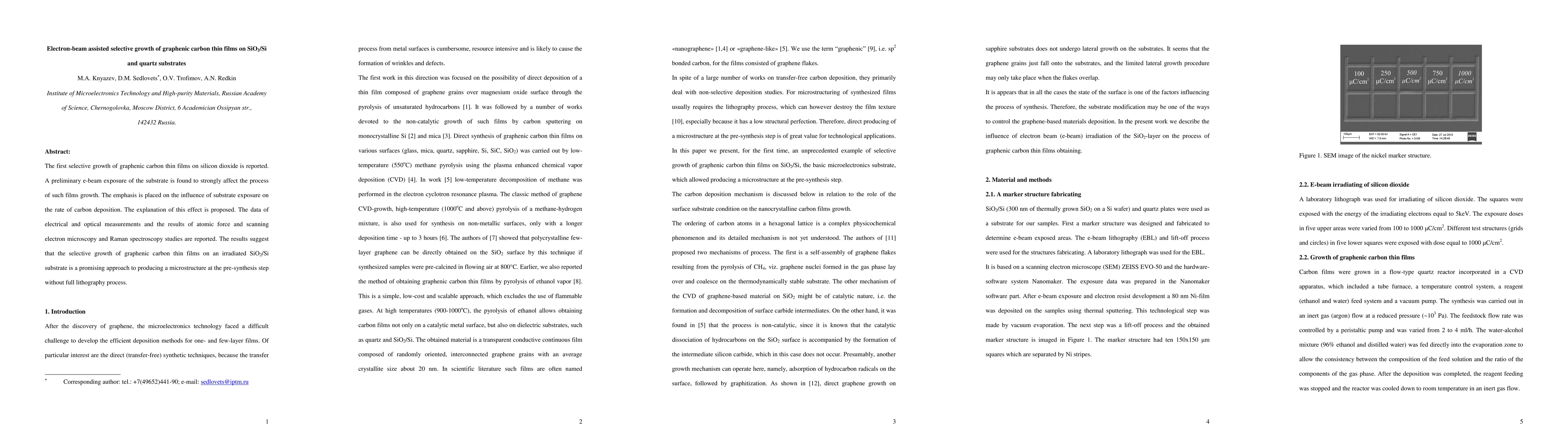 This study reports the first selective growth of graphenic carbon thin films on SiO2/Si and quartz substrates, utilizing electron-beam exposure to influence carbon deposition rates. The results suggest this method offers a promising alternative to traditional lithography for microstructure production.