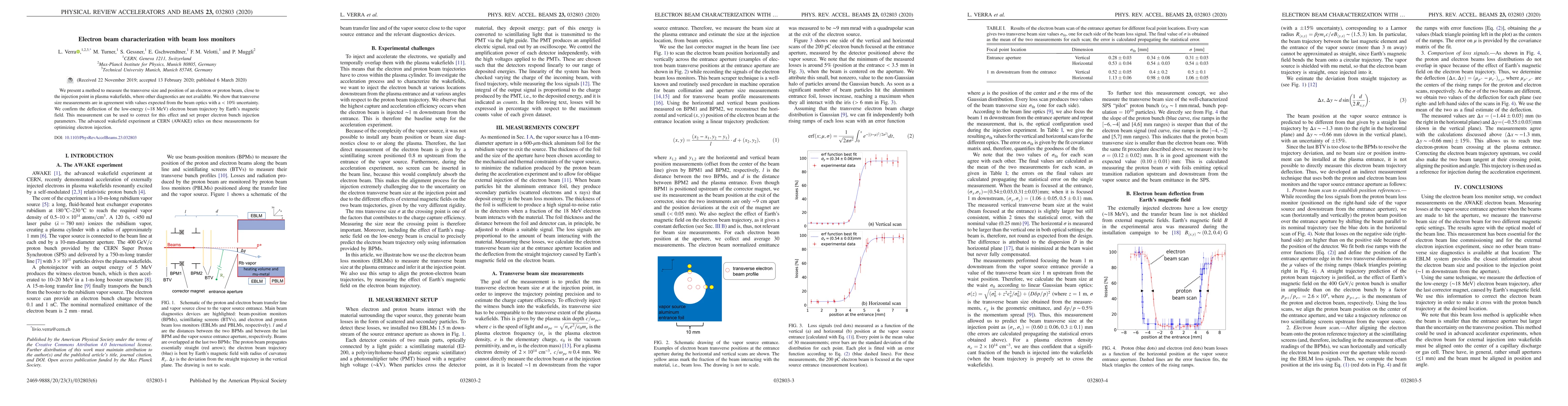 This paper introduces a method for measuring the transverse size and position of electron or proton beams in plasma wakefields using beam loss monitors, achieving <10% uncertainty. It also confirms the deflection of the 18 MeV electron beam by Earth's magnetic field, aiding in optimizing electron injection parameters for the AWAKE experiment at CERN.