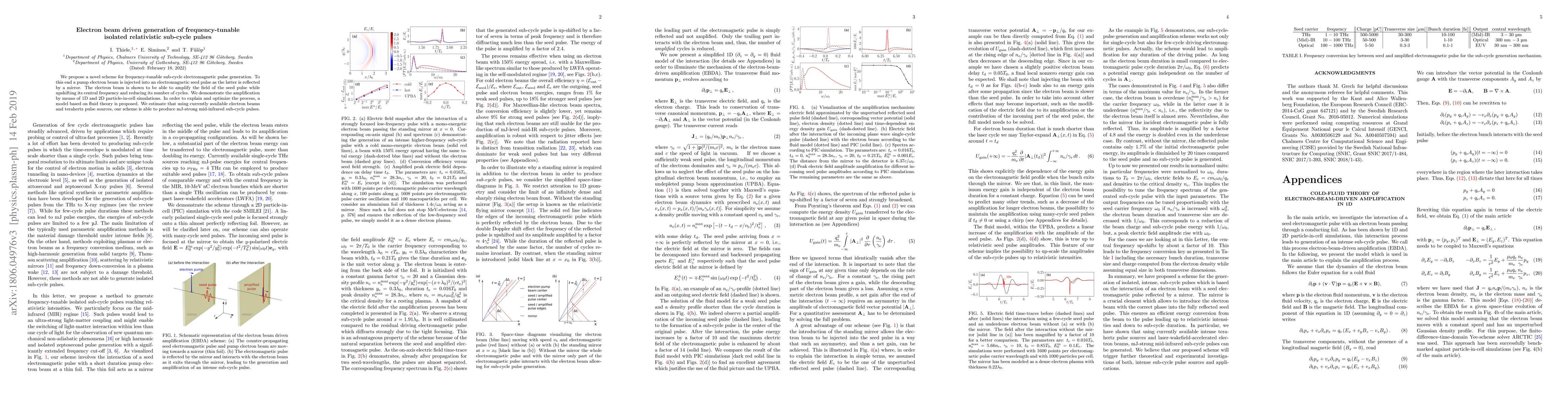 We propose a novel scheme for frequency-tunable sub-cycle electromagnetic pulse generation. To this end a pump electron beam is injected into an electromagnetic seed pulse as the latter is reflected by a mirror. The electron beam is shown to be able to amplify the field of the seed pulse while upshifting its central frequency and reducing its number of cycles. We demonstrate the amplification by means of 1D and 2D particle-in-cell simulations. In order to explain and optimize the process, a model based on fluid theory is proposed. We estimate that using currently available electron beams and terahertz pulse sources, our scheme is able to produce mJ-strong mid-infrared sub-cycle pulses.