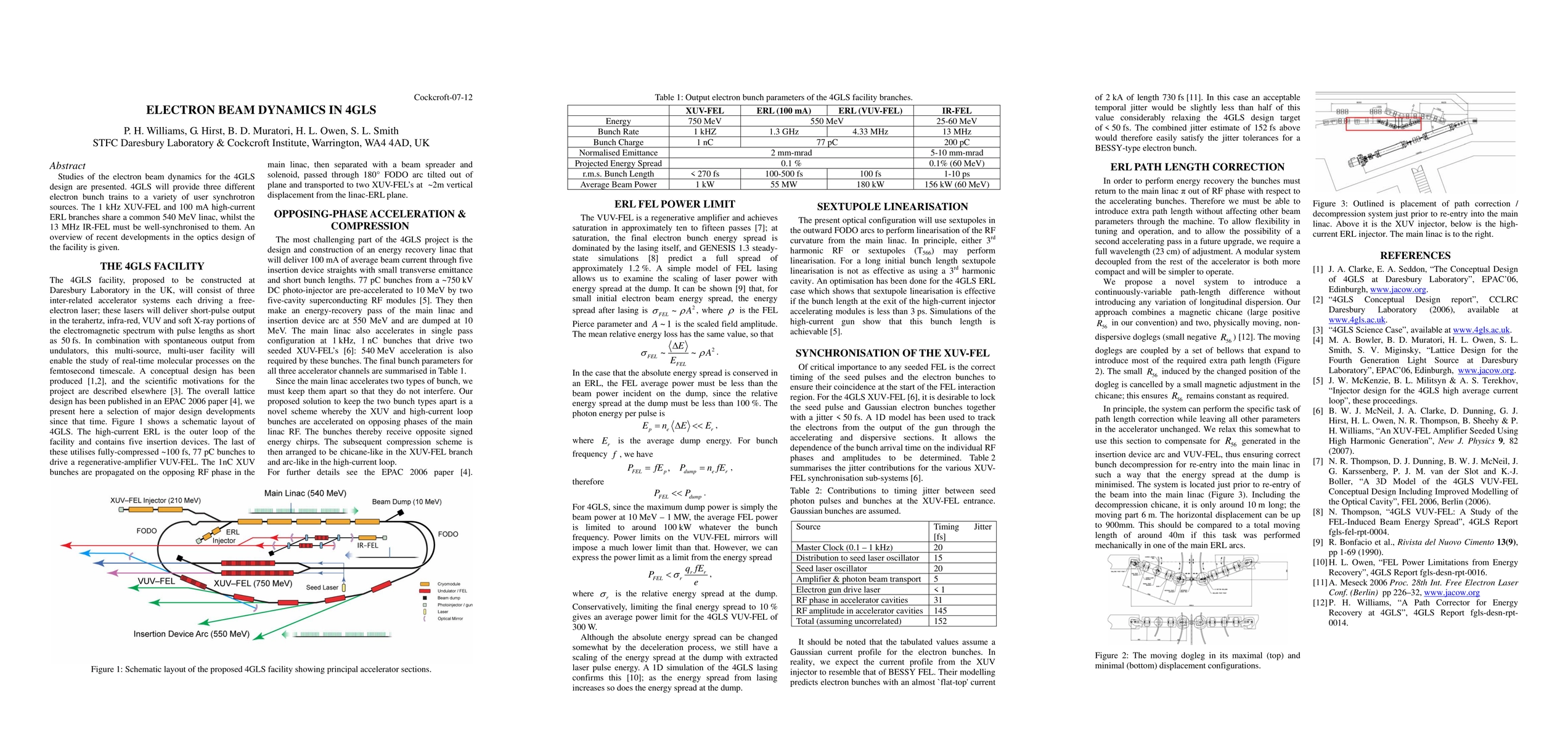 Studies of the electron beam dynamics for the 4GLS design are presented. 4GLS will provide three different electron bunch trains to a variety of user synchrotron sources. The 1 kHz XUV-FEL and 100 mA High Average Current branches share a common 540 MeV linac, whilst the 13 MHz IR-FEL must be well-synchronised to them. An overview of the injector designs, electron transport, and energy recovery is given, including ongoing studies of coherent synchrotron radiation, beam break-up and wakefields. This work is being pursued for the forthcoming Technical Design Report due in 2008.