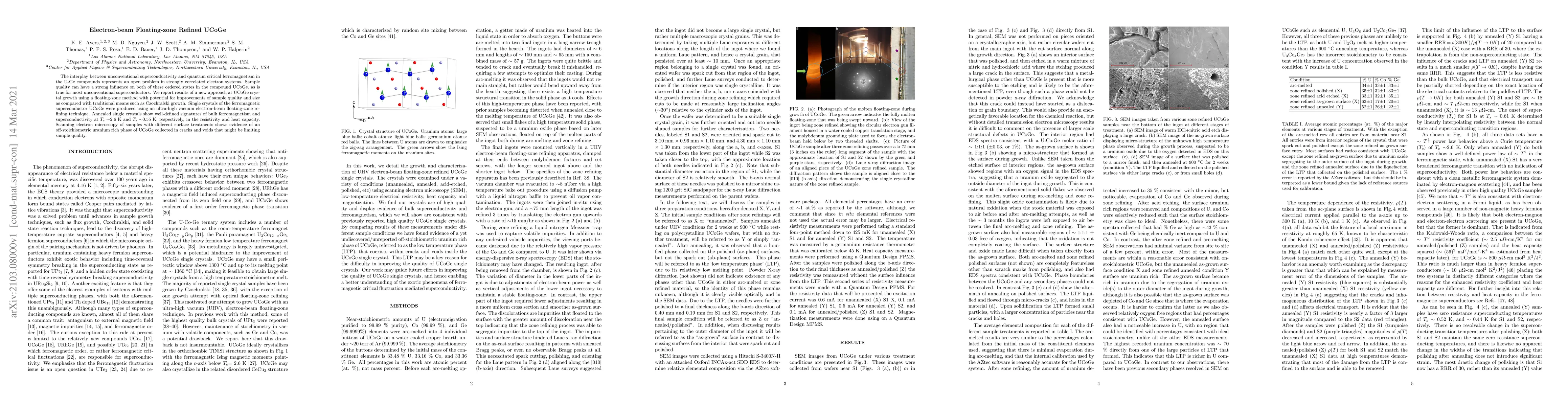 The interplay between unconventional superconductivity and quantum critical ferromagnetism in the U-Ge compounds represents an open problem in strongly correlated electron systems. Sample quality can have a strong influence on both of these ordered states in the compound UCoGe, as is true for most unconventional superconductors. We report results of a new approach at UCoGe crystal growth using a floating-zone method with potential for improvements of sample quality and size as compared with traditional means such as Czochralski growth. Single crystals of the ferromagnetic superconductor UCoGe were produced using an ultra-high vacuum electron-beam floating-zone refining technique. Annealed single crystals show well-defined signatures of bulk ferromagnetism and superconductivity at $T_c \sim$2.6 K and $T_s \sim$0.55 K, respectively, in the resistivity and heat capacity. Scanning electron microscopy of samples with different surface treatments shows evidence of an off-stoichiometric uranium rich phase of UCoGe collected in cracks and voids that might be limiting sample quality.