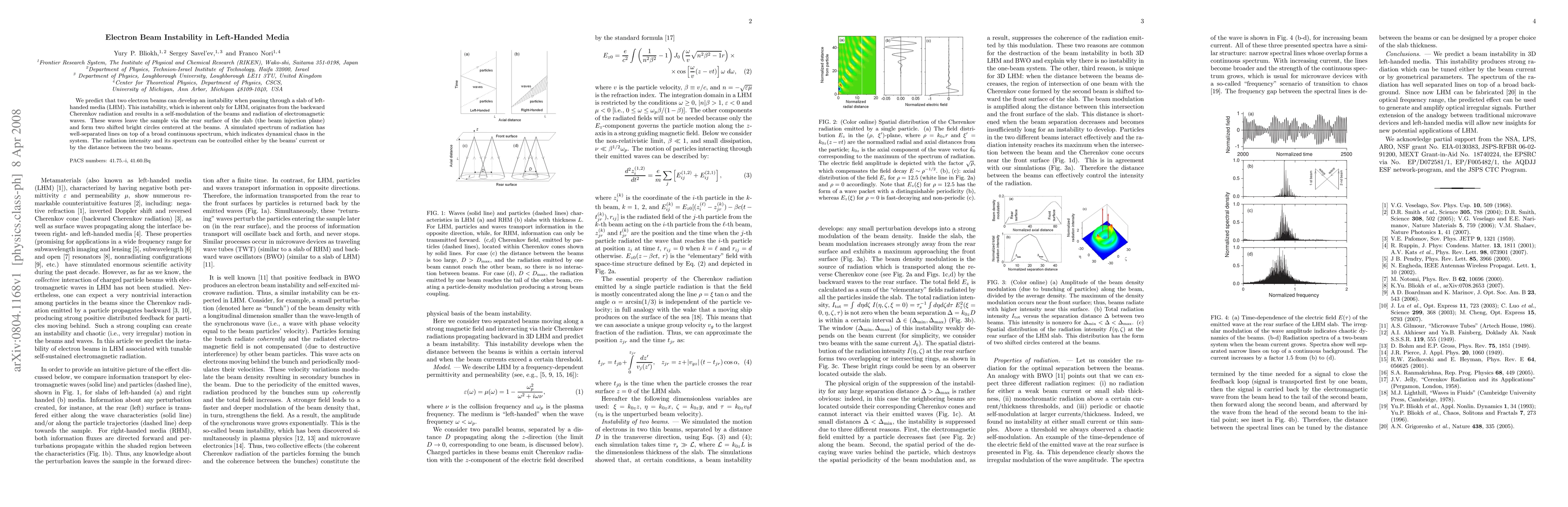 We predict that two electron beams can develop an instability when passing through a slab of left-handed media (LHM). This instability, which is inherent only for LHM, originates from the backward Cherenkov radiation and results in a self-modulation of the beams and radiation of electromagnetic waves. These waves leave the sample via the rear surface of the slab (the beam injection plane) and form two shifted bright circles centered at the beams. A simulated spectrum of radiation has well-separated lines on top of a broad continuous spectrum, which indicates dynamical chaos in the system. The radiation intensity and its spectrum can be controlled either by the beams' current or by the distance between the two beams.