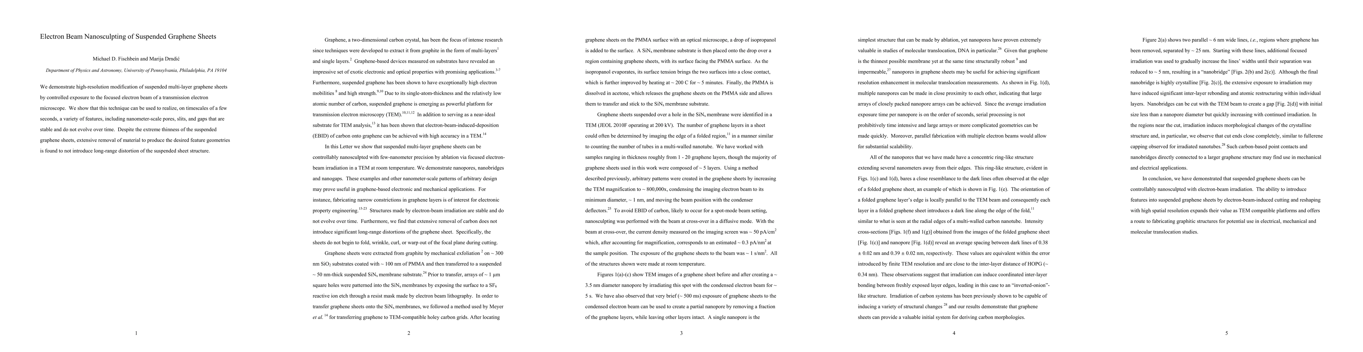 This study presents a method for high-resolution modification of suspended multi-layer graphene using a focused electron beam, enabling the creation of stable nanometer-scale features without causing long-range distortions in the graphene sheets. The technique allows for precise nanosculpting in a few seconds.
