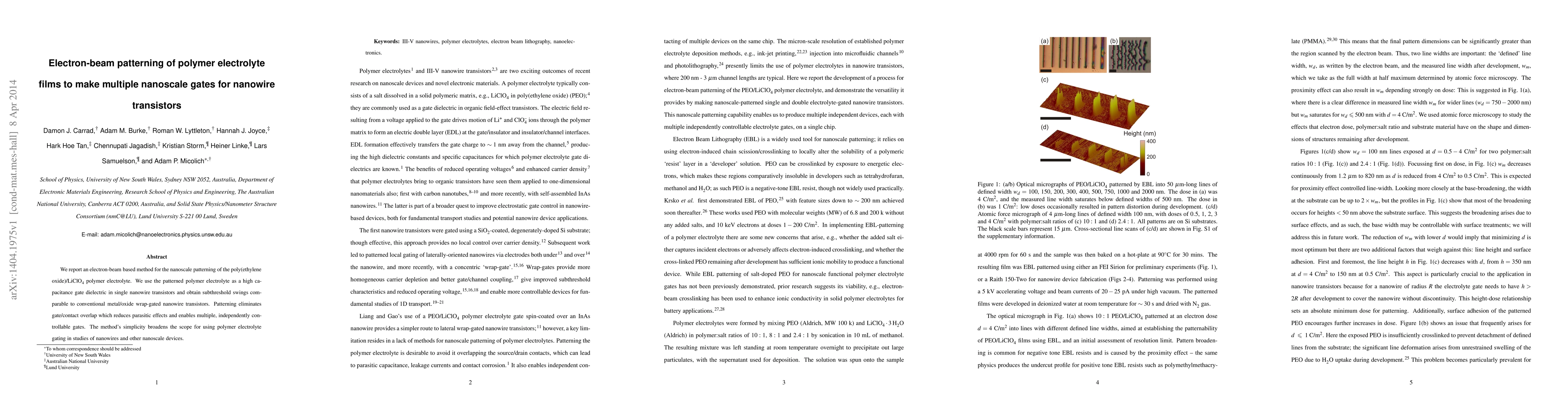 This study introduces an electron-beam technique for precise patterning of polymer electrolyte films, enabling the creation of multiple nanoscale gates in nanowire transistors, which enhances control and reduces parasitic effects compared to traditional methods. The simplicity of this method opens new possibilities for polymer electrolyte gating in nanoscale device research.