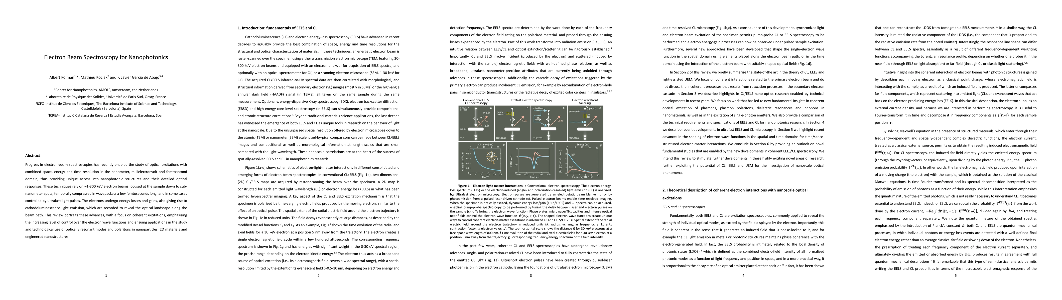 Electron beam spectroscopies have advanced to study nanophotonic structures with high space, energy, and time resolution, revealing unique insights into optical responses and applications in nanoparticles and 2D materials.