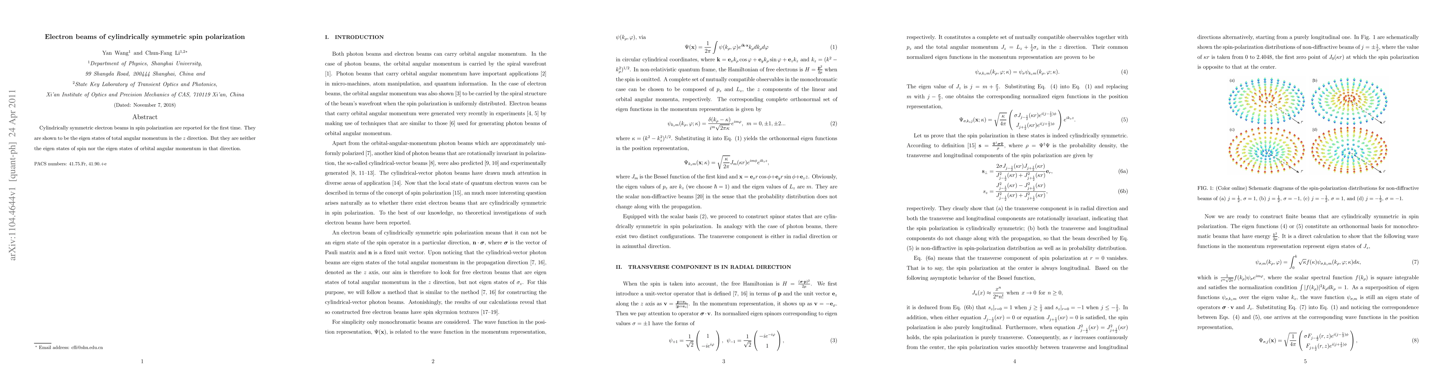 Researchers have discovered cylindrically symmetric electron beams with spin polarization, which are eigenstates of total angular momentum in the z direction but not of spin or orbital angular momentum.