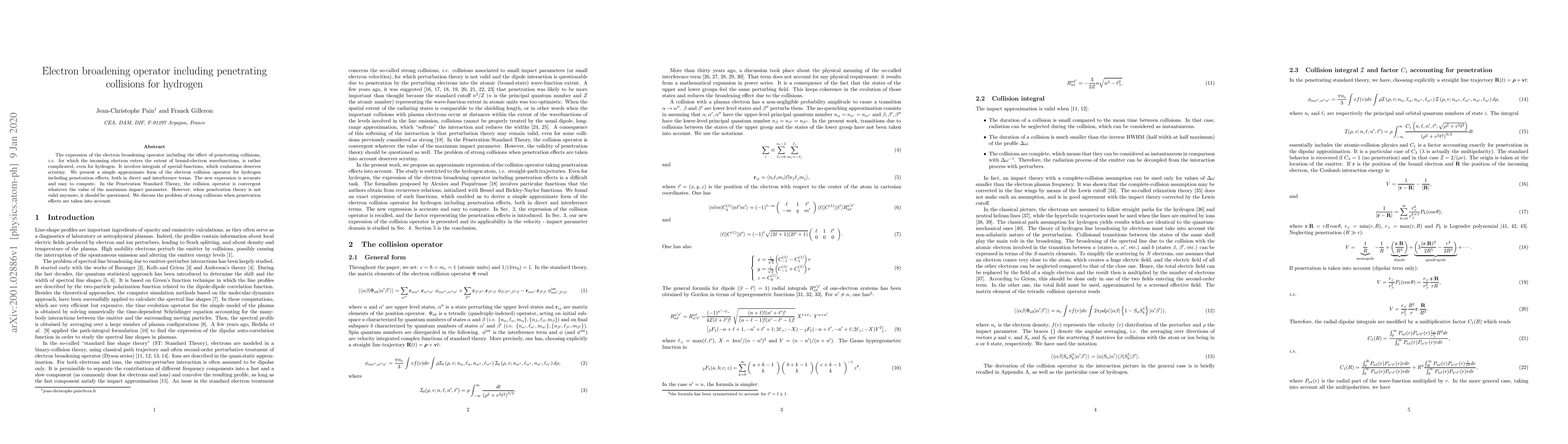 The expression of the electron broadening operator including the effect of penetrating collisions, i.e. for which the incoming electron enters the extent of bound-electron wavefunctions, is rather complicated, even for hydrogen. It involves integrals of special functions, which evaluation deserves scrutiny. We present a simple approximate form of the electron collision operator for hydrogen including penetration effects, both in direct and interference terms. The new expression is accurate and easy to compute. In the Penetration Standard Theory, the collision operator is convergent whatever the value of the maximum impact parameter. However, when penetration theory is not valid anymore, it should be questioned. We discuss the problem of strong collisions when penetration effects are taken into account.