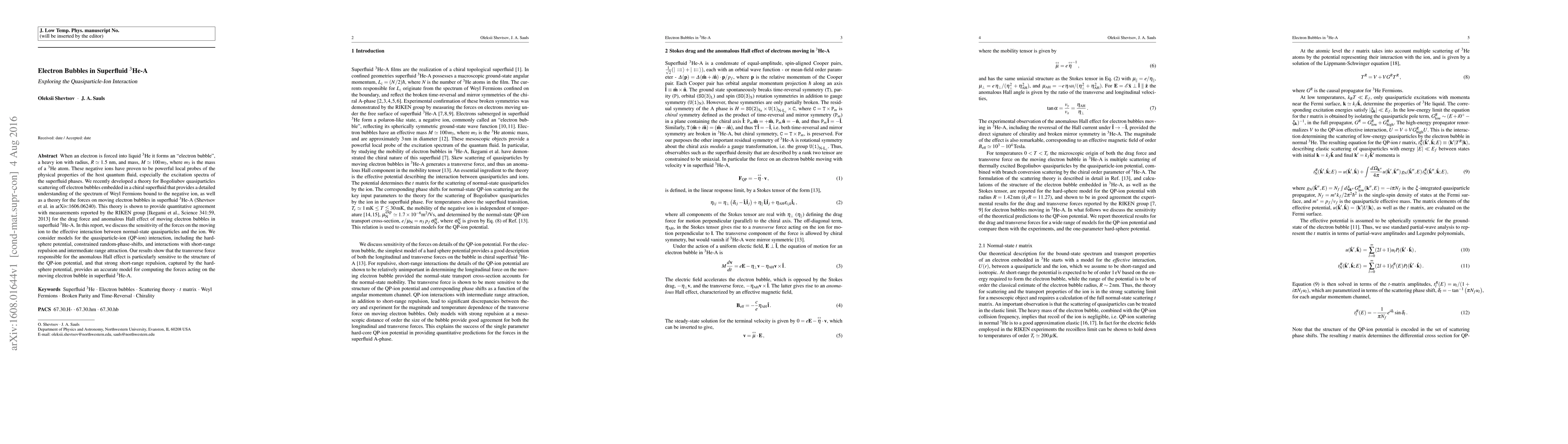 When an electron is forced into liquid $^3$He it forms an "electron bubble", a heavy ion with radius, $R\simeq 1.5$ nm, and mass, $M\simeq 100\,m_3$, where $m_3$ is the mass of a $^3$He atom. These negative ions have proven to be powerful local probes of the physical properties of the host quantum fluid, especially the excitation spectra of the superfluid phases. We recently developed a theory for Bogoliubov quasiparticles scattering off electron bubbles embedded in a chiral superfluid that provides a detailed understanding of the spectrum of Weyl Fermions bound to the negative ion, as well as a theory for the forces on moving electron bubbles in superfluid $^3$He-A (Shevtsov et al. in arXiv:1606.06240). This theory is shown to provide quantitative agreement with measurements reported by the RIKEN group [Ikegami et al., Science 341:59, 2013] for the drag force and anomalous Hall effect of moving electron bubbles in superfluid $^3$He-A. In this report, we discuss the sensitivity of the forces on the moving ion to the effective interaction between normal-state quasiparticles and the ion. We consider models for the quasiparticle-ion (QP-ion) interaction, including the hard-sphere potential, constrained random-phase-shifts, and interactions with short-range repulsion and intermediate range attraction. Our results show that the transverse force responsible for the anomalous Hall effect is particularly sensitive to the structure of the QP-ion potential, and that strong short-range repulsion, captured by the hard-sphere potential, provides an accurate model for computing the forces acting on the moving electron bubble in superfluid $^3$He-A.