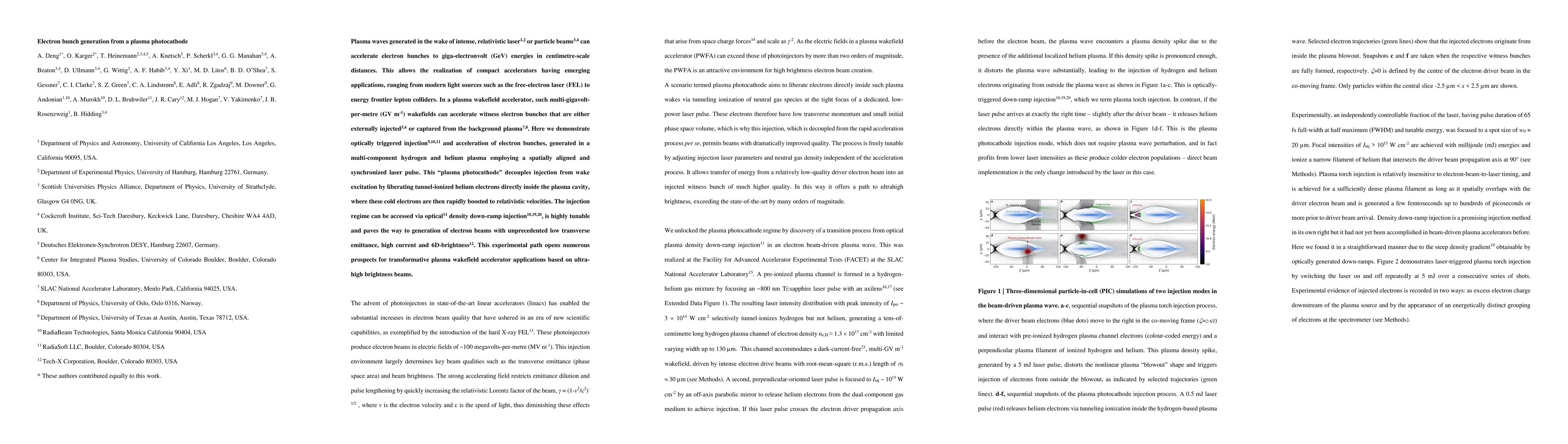 This paper demonstrates the generation of electron bunches using a plasma photocathode, where optically triggered injection and acceleration are achieved in a hydrogen and helium plasma via a synchronized laser pulse. This method promises high-current, low-emittance electron beams for advanced plasma wakefield accelerator applications.