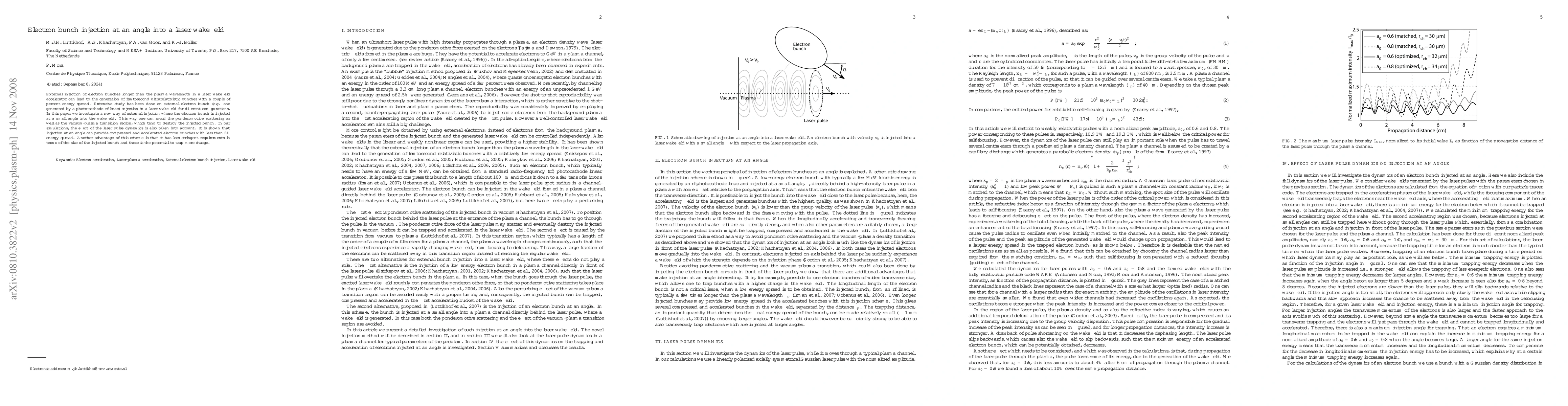 This paper explores electron bunch injection at an angle into a laser wakefield, demonstrating that this method can avoid scattering and transition region issues while producing femtosecond ultrarelativistic electron bunches with a minimal (<2%) energy spread. The angled injection also shows less stringent bunch size requirements and potential for higher charge trapping.