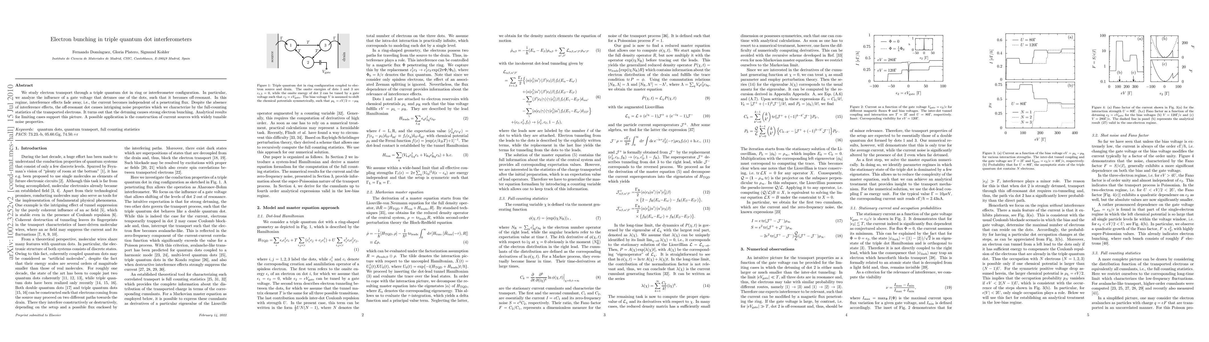 We study electron transport through a triple quantum dot in ring configuration at finite bias. In particular, we analyze the influence of a gate voltage that detunes one of the dots, such that one branch of the interferometer becomes off-resonant. It turns out that then interference effects fade away, i.e., the current becomes independent of a penetrating flux and the detuning. The noise properties which are characterized by the full-counting statistics, however, are governed by bunching effects that may be tuned by the gate voltage. Analytical results for limiting cases support this picture. A possible application is the construction of current sources with widely tunable shot noise properties.