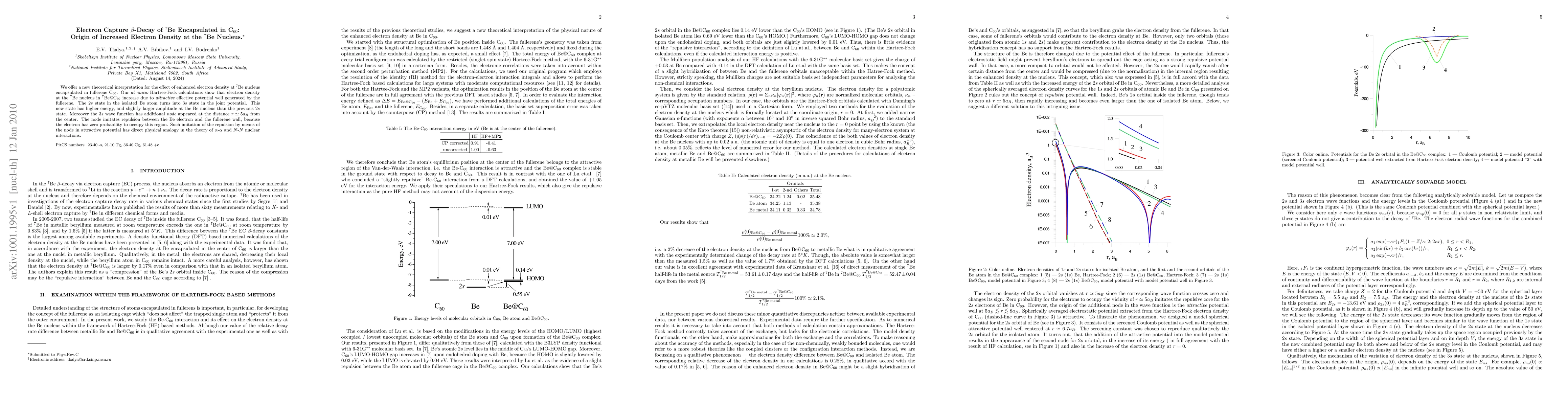 We offer a new theoretical interpretation for the effect of enhanced electron density at $^7$Be nucleus encapsulated in fullerene C$_{60}$. Our {\it{ab initio}} Hartree-Fock calculations show that electron density at the $^7$Be nucleus in $^7$Be@C$_{60}$ increase due to {\it{}attractive} effective potential well generated by the fullerene. The 2$s$ state in the isolated Be atom turns into 3$s$ state in the joint potential. This new state has higher energy, and slightly larger amplitude at the Be nucleus than the previous 2$s$ state. Moreover the 3$s$ wave function has additional {\it{}node} appeared at the distance $r \simeq 5a_B$ from the center. The node imitates repulsion between the Be electron and the fullerene wall, because the electron has zero probability to occupy this region. Such imitation of the repulsion by means of the node in attractive potential has direct physical analogy in the theory of $\alpha$-$\alpha$ and $N$-$N$ nuclear interactions.