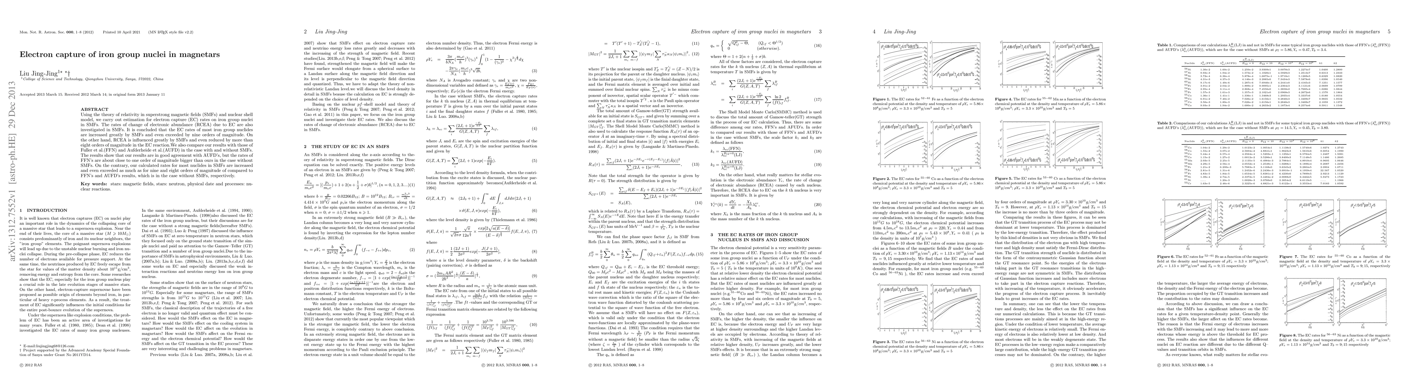Using the theory of relativity in superstrong magnetic fields (SMFs) and nuclear shell model, we carry out estimation for electron capture (EC) rates on iron group nuclei in SMFs. The rates of change of electronic abundance (RCEA) due to EC are also investigated in SMFs. It is concluded that the EC rates of most iron group nuclides are increased greatly by SMFs and even exceeded by nine orders of magnitude. On the other hand, RCEA is influenced greatly by SMFs and even reduced by more than eight orders of magnitude in the EC reaction.We also compare our results with those of Fuller et al.(FFN) and Aufderheide et al.(AUFD) in the case with and without SMFs. The results show that our results are in good agreement with AUFD's, but the rates of FFN's are about close to one order of magnitude bigger than ours in the case without SMFs. On the contrary, our calculated rates for most nuclides in SMFs are increased and even exceeded as much as for nine and eight orders of magnitude of compared to FFN's and AUFD's results, which is in the case without SMFs, respectively.