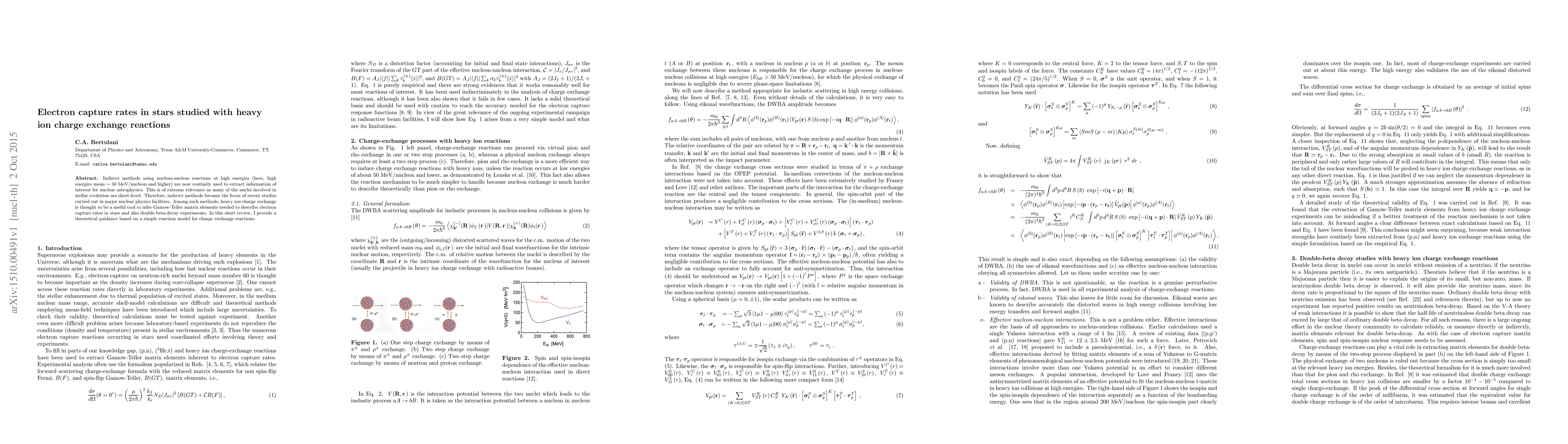This paper reviews the use of high-energy heavy ion charge exchange reactions to infer Gamow-Teller matrix elements, which are crucial for determining electron capture rates in stars, thus contributing to nuclear astrophysics. The theoretical guidance provided is based on a simple reaction model for these charge exchange processes.