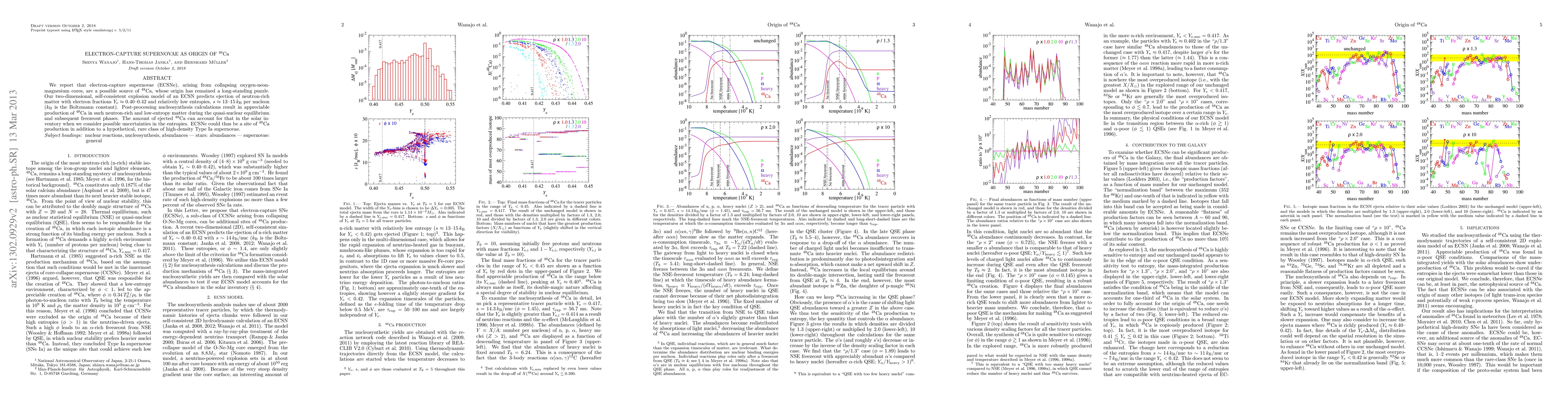 Electron-capture supernovae (ECSNe) may produce significant amounts of 48Ca, potentially solving the longstanding mystery of its origin. These supernovae eject neutron-rich material with specific conditions that favor 48Ca nucleosynthesis, suggesting they could be a major source alongside rare high-density Type Ia supernovae.