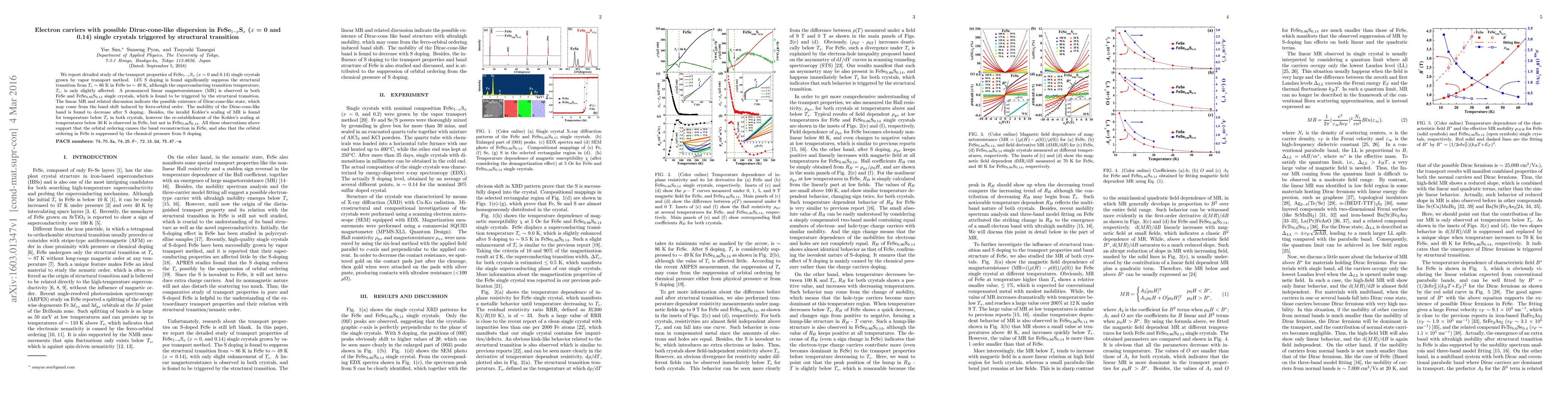 This study investigates the transport properties of FeSe and FeSe$_{0.86}$S$_{0.14}$ single crystals, revealing a pronounced linear magnetoresistance triggered by structural transitions. The findings suggest a possible Dirac-cone-like dispersion in the electron carriers, likely due to band shifts from ferro-orbital order, with mobility decreasing after sulfur doping.