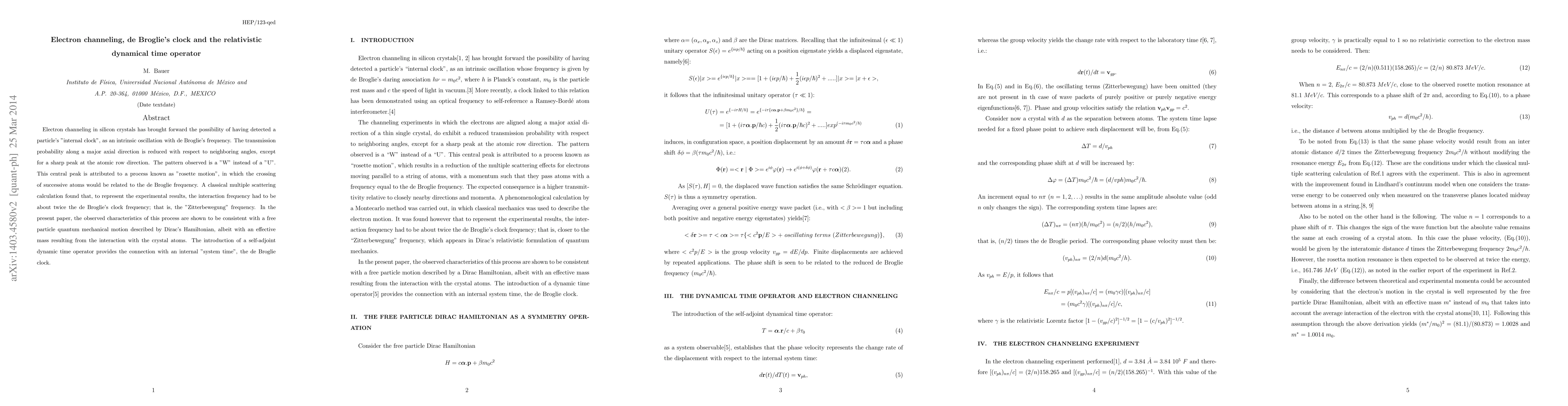 Electron channeling in silicon crystals has brought forward the possibility of having detected a particle's "internal clock", as an intrinsic oscillation with de Broglie's frequency. The transmission probability along a major axial direction is reduced with respect to neighboring angles, except for a sharp peak at the atomic row direction. The pattern observed is a "W" instead of a "U". This central peak is attributed to a process known as "rosette motion", in which the crossing of successive atoms would be related to the de Broglie frequency. A classical multiple scattering calculation found that, to represent the experimental results, the interaction frequency had to be about twice the de Broglie's clock frequency; that is, the "Zitterbewegung" frequency. In the present paper, the observed characteristics of this process are shown to be consistent with a free particle quantum mechanical motion described by Dirac's Hamiltonian, albeit with an effective mass resulting from the interaction with the crystal atoms. The introduction of a self-adjoint dynamic time operator provides the connection with an internal "system time", the de Broglie clock.