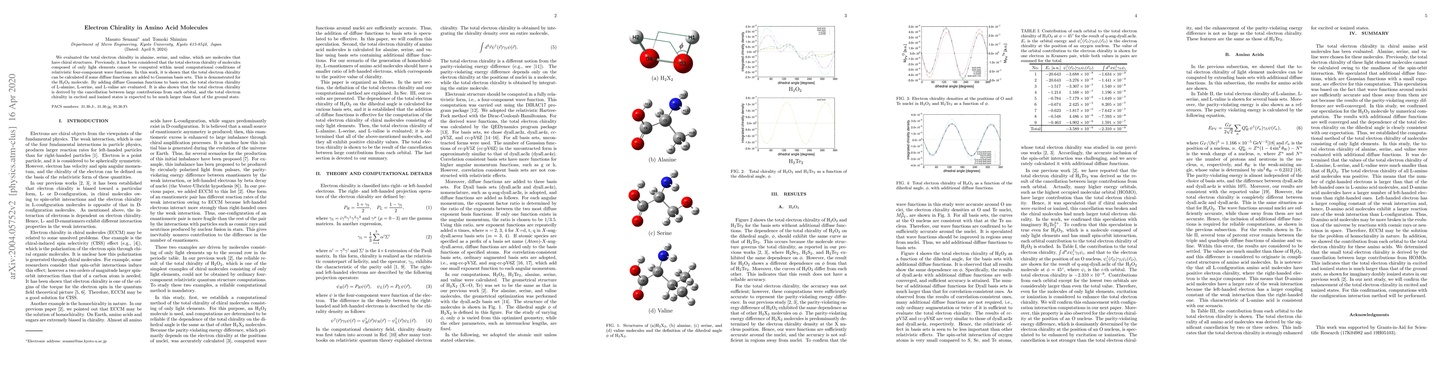 We evaluated the total electron chirality in alanine, serine, and valine, which are molecules that have chiral structures. Previously, it has been considered that the total electron chirality of molecules composed of only light elements cannot be computed within usual computational conditions of relativistic four-component wave functions. In this work, it is shown that the total electron chirality can be calculated if some diffuse functions are added to Gaussian basis sets. This is demonstrated for the H$_2$O$_2$ molecule. By adding diffuse Gaussian functions to basis sets, the total electron chirality of L-alanine, L-serine, and L-valine are evaluated. It is also shown that the total electron chirality is derived by the cancellation between large contributions from each orbital, and the total electron chirality in excited and ionized states is expected to be much larger than that of the ground state.