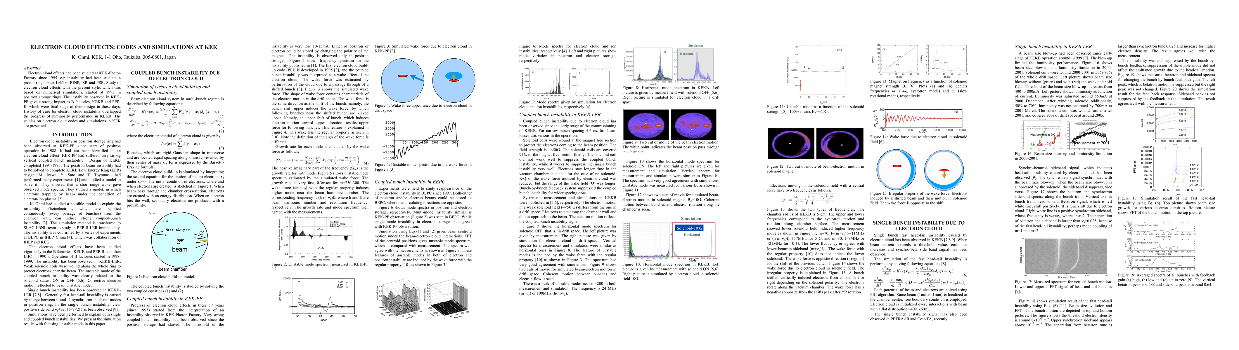 Electron cloud effects had been studied at KEK-Photon Factory since 1995. e-p instability had been studied in proton rings since 1965 in BINP, ISR and PSR. Study of electron cloud effects with the present style, which was based on numerical simulations, started at 1995 in positron storage rings. The instability observed in KEKPF gave a strong impact to B factories, KEKB and PEPII, which were final stage of their design in those days. History of cure for electron cloud instability overlapped the progress of luminosity performance in KEKB. The studies on electron cloud codes and simulations in KEK are presented.