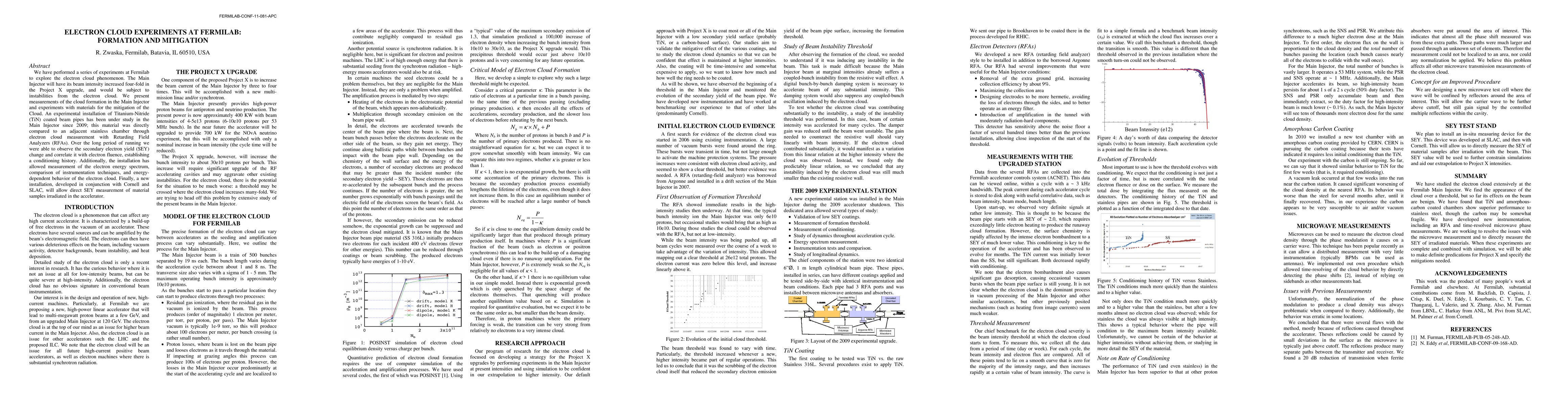 We have performed a series of experiments at Fermilab to explore the electron cloud phenomenon. The Main Injector will have its beam intensity increased four-fold in the Project X upgrade, and would be subject to instabilities from the electron cloud. We present measurements of the cloud formation in the Main Injector and experiments with materials for the mitigation of the Cloud. An experimental installation of Titanium-Nitride (TiN) coated beam pipes has been under study in the Main Injector since 2009; this material was directly compared to an adjacent stainless chamber through electron cloud measurement with Retarding Field Analyzers (RFAs). Over the long period of running we were able to observe the secondary electron yield (SEY) change and correlate it with electron fluence, establishing a conditioning history. Additionally, the installation has allowed measurement of the electron energy spectrum, comparison of instrumentation techniques, and energy-dependent behavior of the electron cloud. Finally, a new installation, developed in conjunction with Cornell and SLAC, will allow direct SEY measurement of material samples irradiated in the accelerator.