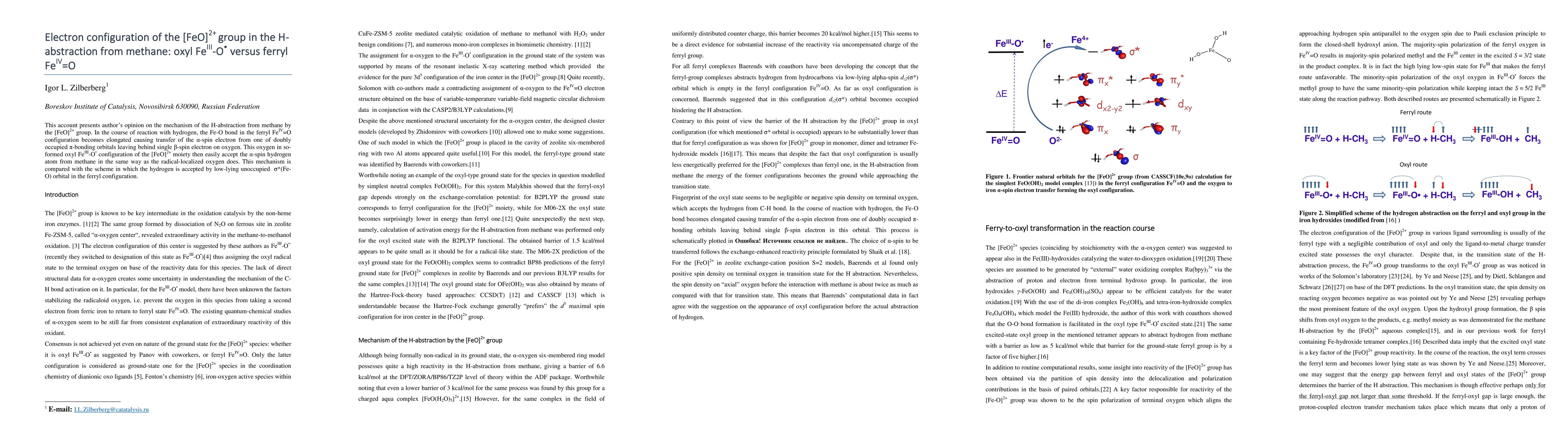 This account presents author's opinion on the mechanism of the H-abstraction from methane by the [FeO](2+) group. In the course of reaction with hydrogen, the Fe-O bond in the ferryl configuration becomes elongated causing transfer of the spin-up electron from one of doubly occupied bonding orbitals leaving behind single spin-down electron on oxygen. This oxygen in so-formed oxyl configuration of the [FeO](2+) moiety then easily accept the spin-up hydrogen atom from methane in the same way as the radical-localized oxygen does. This mechanism is compared with the scheme in which the hydrogen is accepted by low-lying unoccupied antibonding orbital in the ferryl configuration.