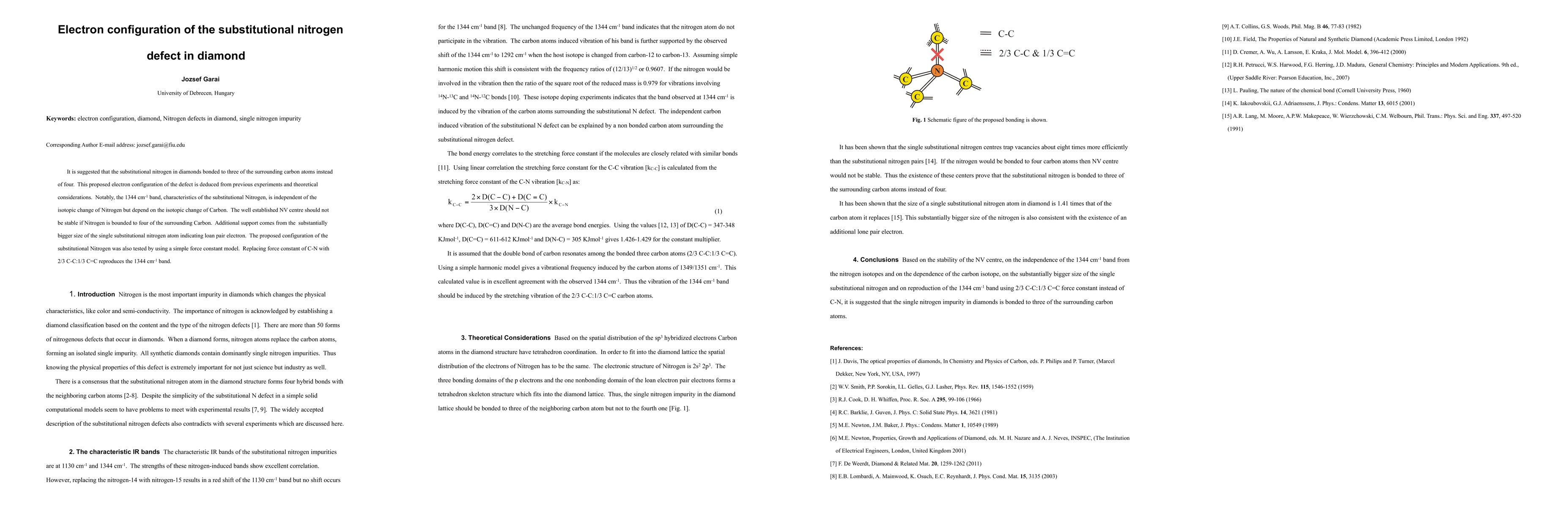 This paper proposes that substitutional nitrogen in diamonds bonds with three carbon atoms instead of four, supported by experimental and theoretical evidence. The observed 1344 cm-1 band's independence from nitrogen isotopic changes but dependence on carbon isotopes further validates this configuration.