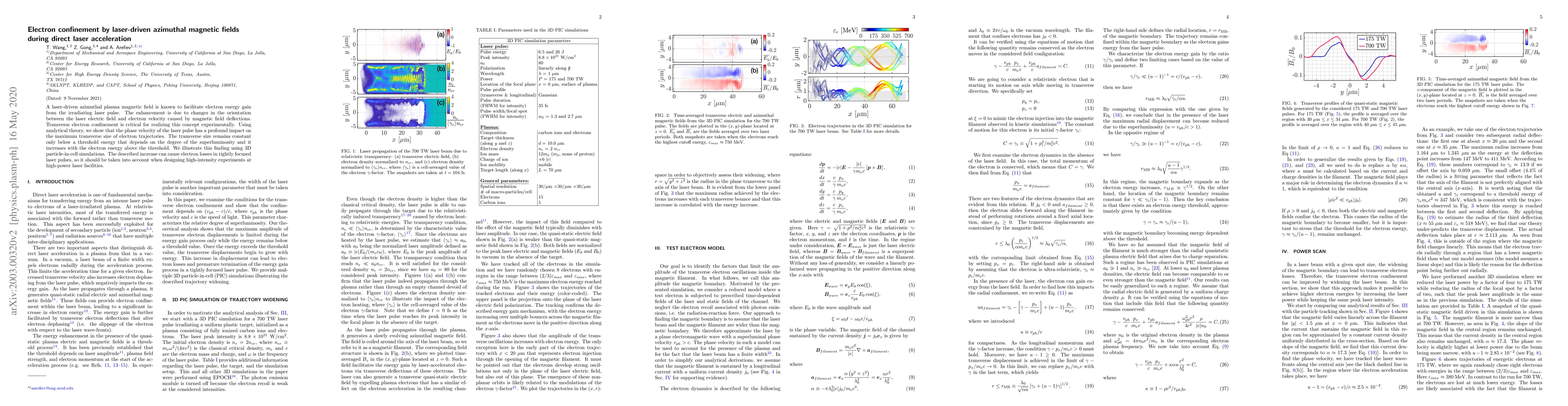 Summary: This paper investigates how laser-driven azimuthal magnetic fields enhance electron energy gain during direct laser acceleration, finding that electron confinement is crucial. Simulations show that increasing laser power at fixed intensity can significantly boost energy gain by maintaining transverse confinement, suggesting the need for experiments at multi-PW laser facilities.