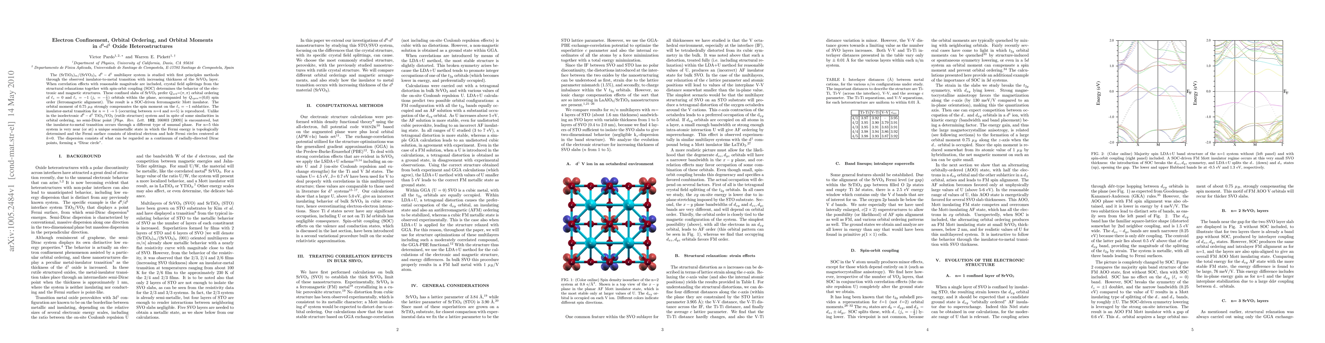 The (SrTiO$_3$)$_m$/(SrVO$_3$)$_n$ $d^0-d^1$ multilayer system is studied with first principles methods through the observed insulator-to-metal transition with increasing thickness of the SrVO$_3$ layer. When correlation effects with reasonable magnitude are included, crystal field splittings from the structural relaxations together with spin-orbit coupling (SOC) determines the behavior of the electronic and magnetic structures. These confined slabs of SrVO$_3$ prefer $Q_{orb}$=($\pi,\pi$) orbital ordering of $\ell_z = 0$ and $\ell_z = -1$ ($j_z=-1/2$) orbitals within the plane, accompanied by $Q_{spin}$=(0,0) spin order (ferromagnetic alignment). The result is a SOC-driven ferromagnetic Mott insulator. The orbital moment of 0.75 $\mu_B$ strongly compensates the spin moment on the $\ell_z = -1$ sublattice. The insulator-metal transition for $n = 1 \to 5$ (occurring between $n$=4 and $n$=5) is reproduced. Unlike in the isoelectronic $d^0-d^1$ TiO$_2$/VO$_2$ (rutile structure) system and in spite of some similarities in orbital ordering, no semi-Dirac point [{\it Phys. Rev. Lett.} {\bf 102}, 166803 (2009)] is encountered, but the insulator-to-metal transition occurs through a different type of unusual phase. For n=5 this system is very near (or at) a unique semimetallic state in which the Fermi energy is topologically determined and the Fermi surface consists of identical electron and hole Fermi circles centered at $k$=0. The dispersion consists of what can be regarded as a continuum of radially-directed Dirac points, forming a "Dirac circle".